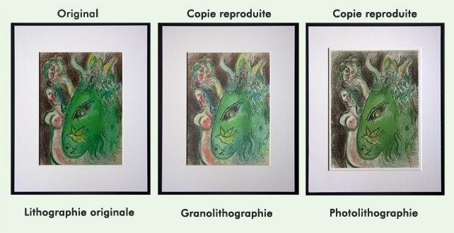 Pour vous aider à comprendre, voici un exemple de l'une des estampes les plus célèbres de Chagall : son « Paradis » avec l'âne vert. Soyez honnête : auriez-vous reconnu la lithographie originale parmi ces 3 estampes, si ce n'était pas précisé ? Ou si le texte de vente se contentait de dire :