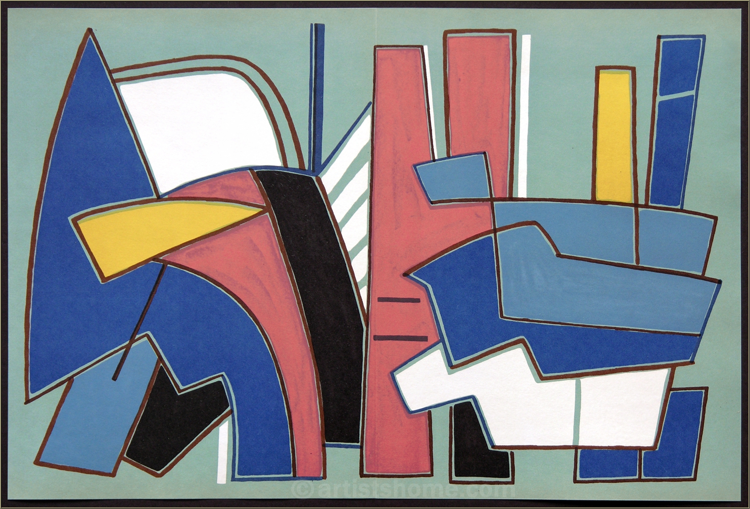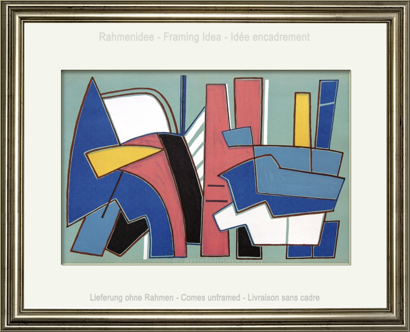 Détails :« Construction géométrique » Avec à peine 100 œuvres réunies dans son catalogue raisonné en 40 de carrière artistique, on peut qualifier de plutôt restreinte la création d’estampes de Magnelli. Cette belle lithographie en couleurs, non signée, à la construction picturale assez marquante, n’a pas de titre – comme presque toutes les estampes de l’artiste, laissant libre cours à l’interprétation de l’observateur.