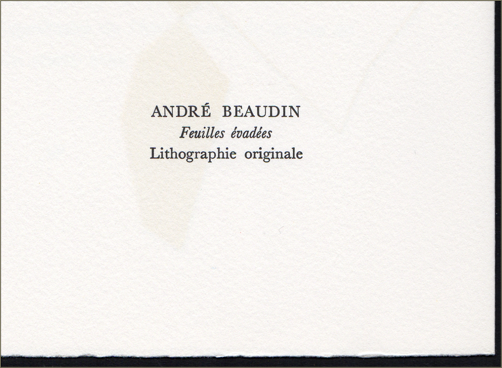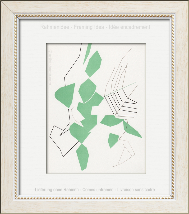 | | « Feuilles évadées » 1972 | Technique : | Lithographie originale en couleurs pour « Souvenirs et portraits d'artistes ». Texte au verso : « André Beaudin - Feuilles évadées - Lithographie originale » Ceci n'est pas une reproduction récente (tirage d'art) qui a été copiée selon des procédés de reproduction photomécanique, mais la lithographie originale de 1972. ATTENTION: il semble actuellement que des impressions d'apparence similaire sont disponibles à la vente sur internet pour de faibles sommes. Il s'agit de réimpressions tardives et non autorisées (des copies pirates). Ces tirages ne sont pas des lithographies originales ! | | Année de réalisation : | 1972 | | Formats : | 32,5 x 25 cm (feuille) | | Tirage | Papier : | Une des 800 épreuves de l'édition limitée sur papier Arches, non signées | | Éditeur : | Alain C. Mazo, Paris u. Léon Amiel, New York, 1972 | | Imprimeur : | Mourlot, Paris | | Référence : | cf. https://mourlot.com « Livres de Fernand Mourlot » Une preuve d'identité de l'œuvre sera fournie (sans prix dans le cas d'un cadeau). | | État : | Details En parfait état de conservation. Cadre non fourni. | Évaluations des clients : Il n'y a pas encore d'evaluations. Seulement les client qui ont acheté cet article et qui sont connecté peuvent l'evaluer. Votre nom est automatiquement affiché de manière anonyme, par ex. « Olivier M., France ».  *Valent pour les livraisons vers l'Allemagne payées via PayPal. En cas de paiement par virement bancaire, la livraison prendra un à trois jours de plus à partir du jour du virement en question. Pour connaître les délais de livraison pour d’autres pays et estimer le jour de livraison, rendez-vous ici |