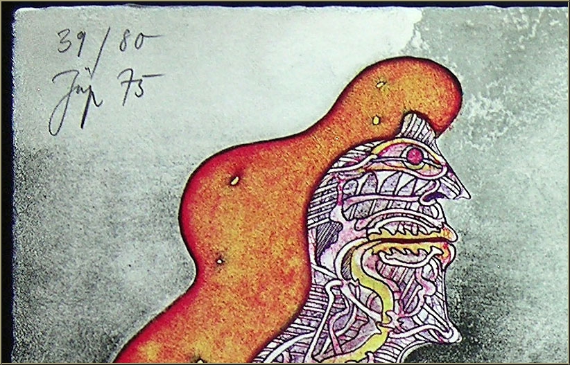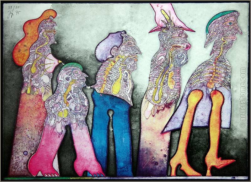 Détails :« Umzug nach Frankfurt » (Déménagement pour Francfort) 1975 Lithographie originale en couleurs de l'artiste allemand, qui était reconnu pour ses « Images des rayons X »