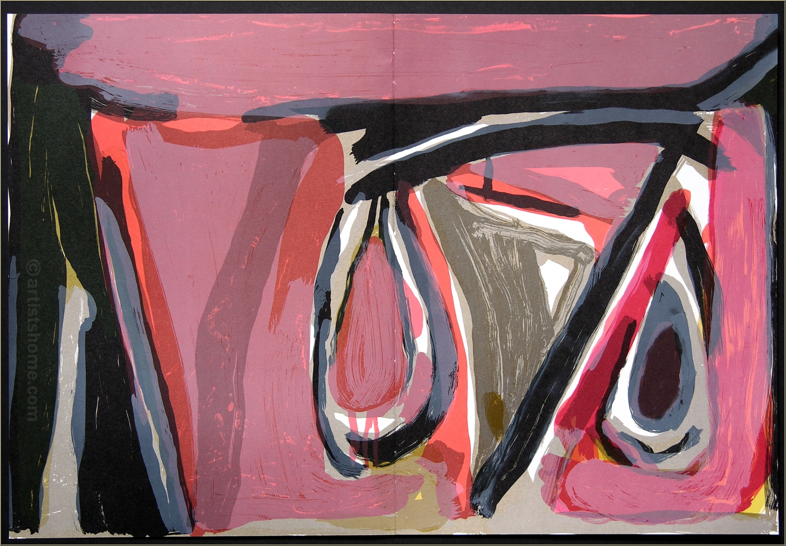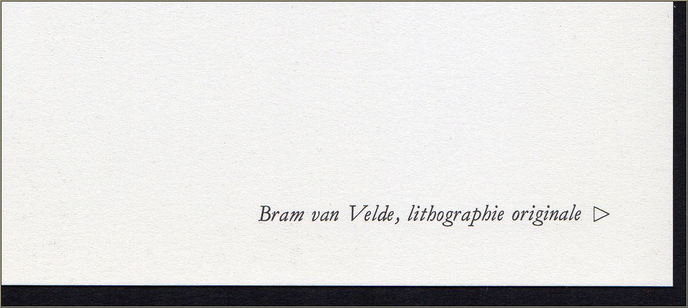 | | Lithographie originale en couleurs de Bram van Velde, 1982 (créé en 1975). | | Dimensions: | 38 x 56 cm (feuille = sujet) | | Papier: | Lithographie en double page sur papier Vélin | | Remarques: | Ceci n'est pas une reproduction récente ou un retirage (quadrichromie ou grano lithographie d'une "édition limitée") mais la lithographie originale ! Imprimée au verso, entre autres avec « Bram van Velde, lithographie originale ». Avec des petits trous correspondant à la reliure cousue et pli central normal des lithographies originales publiées en doubles pages. | | Éditeur: | Galerie Maeght, Paris, 1982 | | Références: | Mason-Putman, Bram van Velde. Les lithographies II, 1974 - 1978, Cabinet des estampes, Musée d'art et d'histoire, Genève 1979, page 31, N° 157 (1975) Une photocopie du catalogue raisonné pourra être fournie à l'acheteur. En plus, vous recevez une preuve d'indentité de la galerie. | | État: | Details En très bon état de conservation. Livraison non encadré. | | Évaluations des clients : Il n'y a pas encore d'evaluations. Seulement les client qui ont acheté cet article et qui sont connecté peuvent l'evaluer. Votre nom est automatiquement affiché de manière anonyme, par ex. « Olivier M., France ».  *Valent pour les livraisons vers l'Allemagne payées via PayPal. En cas de paiement par virement bancaire, la livraison prendra un à trois jours de plus à partir du jour du virement en question. Pour connaître les délais de livraison pour d’autres pays et estimer le jour de livraison, rendez-vous ici |
