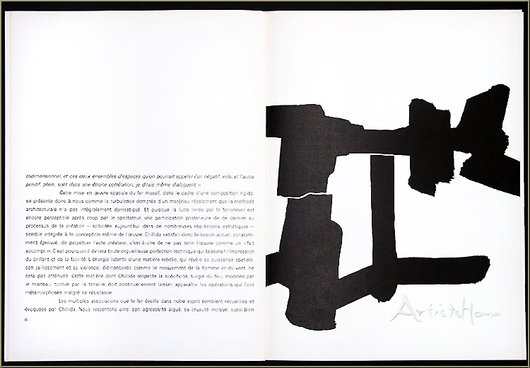 | | | Derrière le miroir (DLM) 143 - 1964 "Chillida" - Numéro complet de la revue consacré à Chillida, comportant 4 lithographies originales - en parfait état ! | | À propos de Derrière le miroir: | | Derrière le miroir, une revue d'art exceptionnelle, illustrée de lithographies originales d´artistes acclamés, sur des textes originaux des grands poètes et écrivains de l’époque, fut éditée de 1946 à 1982 et accompagnait chaque exposition de la Galerie Maeght. | | Détails: | DLM n° 143: Publié à l'occasion de l'exposition d'Eduardo Chillida à la Galerie Maeght en l'an 1964. Comportant 4 lithographies originales de Chillida: "Dentro Y Fuera | Inside Outside" (van der Koelen 64003, 38 x 28 cm) "Tempo I" (van der Koelen 64004, 38 x 28 cm) "Tempo II" (van der Koelen 64005, 38 x 56 cm) "Levitation I" (van der Koelen 64006, 38 x 28 cm) Nombre des pages: 28 pp. non reliées + 2 pp. "Chroniques" Dimensions de la revue: 38 x 28 cm Éditeur: Maeght, Paris Imprimée par: Mourlot, Paris (pour les lithographies) Texte(s): Carola Giedion-Welcker Tirage originale. | | Catalogue raisonné / Référence: | | van der Koelen, Martin. Eduardo Chillida. Werkverzeichnis der Druckgraphik Opus P.1, 1959-1972, Chorus-Verlag München, 2000, pp. 72-79, N° 64003 - 64006. | | État: | [X] Complète Details En parfait état, comme neuf ! | | Évaluations des clients : Il n'y a pas encore d'evaluations. Seulement les client qui ont acheté cet article et qui sont connecté peuvent l'evaluer. Votre nom est automatiquement affiché de manière anonyme, par ex. « Olivier M., France ».  *Valent pour les livraisons vers l'Allemagne payées via PayPal. En cas de paiement par virement bancaire, la livraison prendra un à trois jours de plus à partir du jour du virement en question. Pour connaître les délais de livraison pour d’autres pays et estimer le jour de livraison, rendez-vous ici |