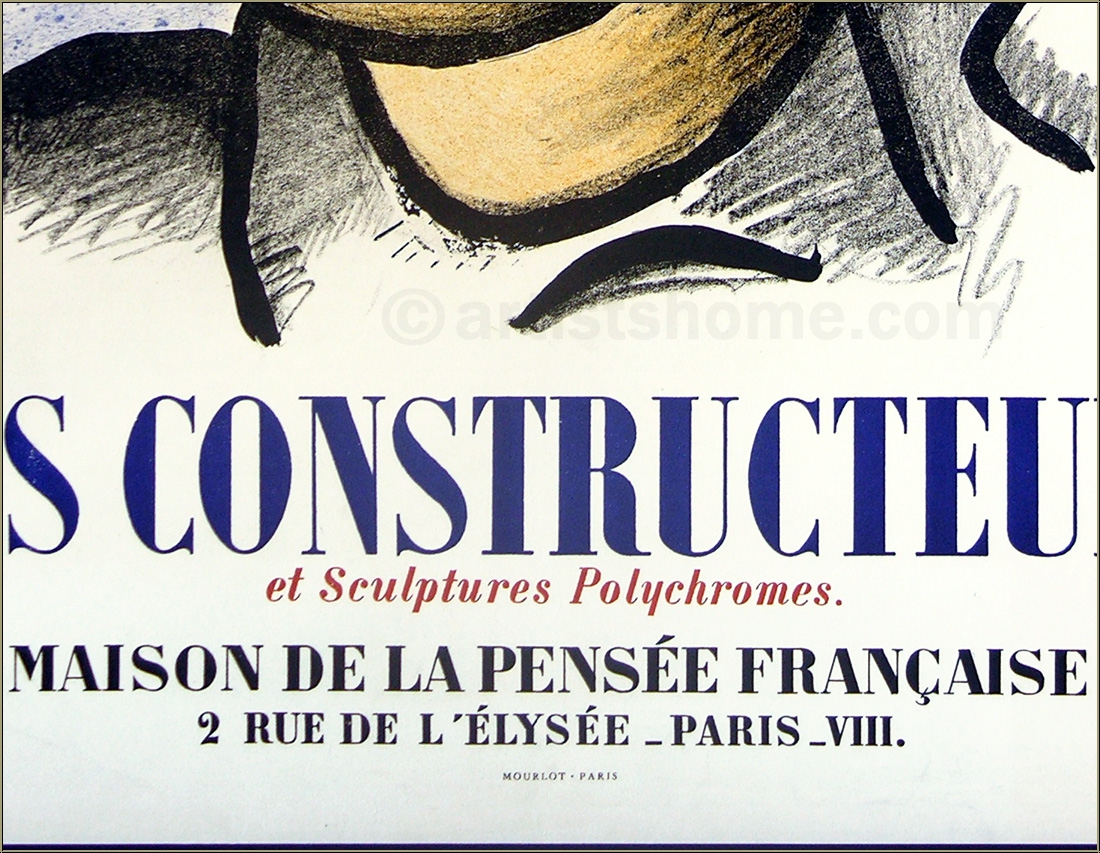 | | "Les constructeurs", Maison de la Pensée Française, Lithographie originale Selon le catalogue raisonne [Saphire] ceci la seule affiche d'exposition de Fernand Léger avec une lithographie originale : "L'ouvrier" | Oeuvre / Technique : | Affiche originale, réalisée en 1951 Lithographie originale imprimée en cinq couleurs | | Dimensions : | 76,5 x 51,5 cm (affiche) - 59,5 x 50 cm (illustration) | | Tirage | Papier : | Une des 800 épreuves de l'édition limitée, imprimée sur papier affiche. Rare ! | | Éditeur : | Maison de la Pensée Française, Paris | | Imprimeur : | Mourlot, Paris | | Références : | Saphire, Lawrence et Mourlot, Fernand. Fernand Leger. The Complete Graphic Work. Blue Moon Press, New York, 1978, page 170, n° 108 Une photocopie du catalogue raisonné pourra être fournie à l'acheteur. | | État : | Details Très bon état général, quelques légères taches et traces d'utilisation dans les bords, n'affectent pas l'image. | | | Cette affiche rare a été nettoyée, désacidifiée, raccommodée et lissée avec soin par notre expert en la matière. Elle a été contrecollée sur toile fine de lin calandré, que l'on utilise déjà depuis des générations pour conserver le papier. Apprenez-en plus sur Conserver et recevoir des affiches d'artistes et estampes originales. | Évaluations des clients : Il n'y a pas encore d'evaluations. Seulement les client qui ont acheté cet article et qui sont connecté peuvent l'evaluer. Votre nom est automatiquement affiché de manière anonyme, par ex. « Olivier M., France ».  *Valent pour les livraisons vers l'Allemagne payées via PayPal. En cas de paiement par virement bancaire, la livraison prendra un à trois jours de plus à partir du jour du virement en question. Pour connaître les délais de livraison pour d’autres pays et estimer le jour de livraison, rendez-vous ici |