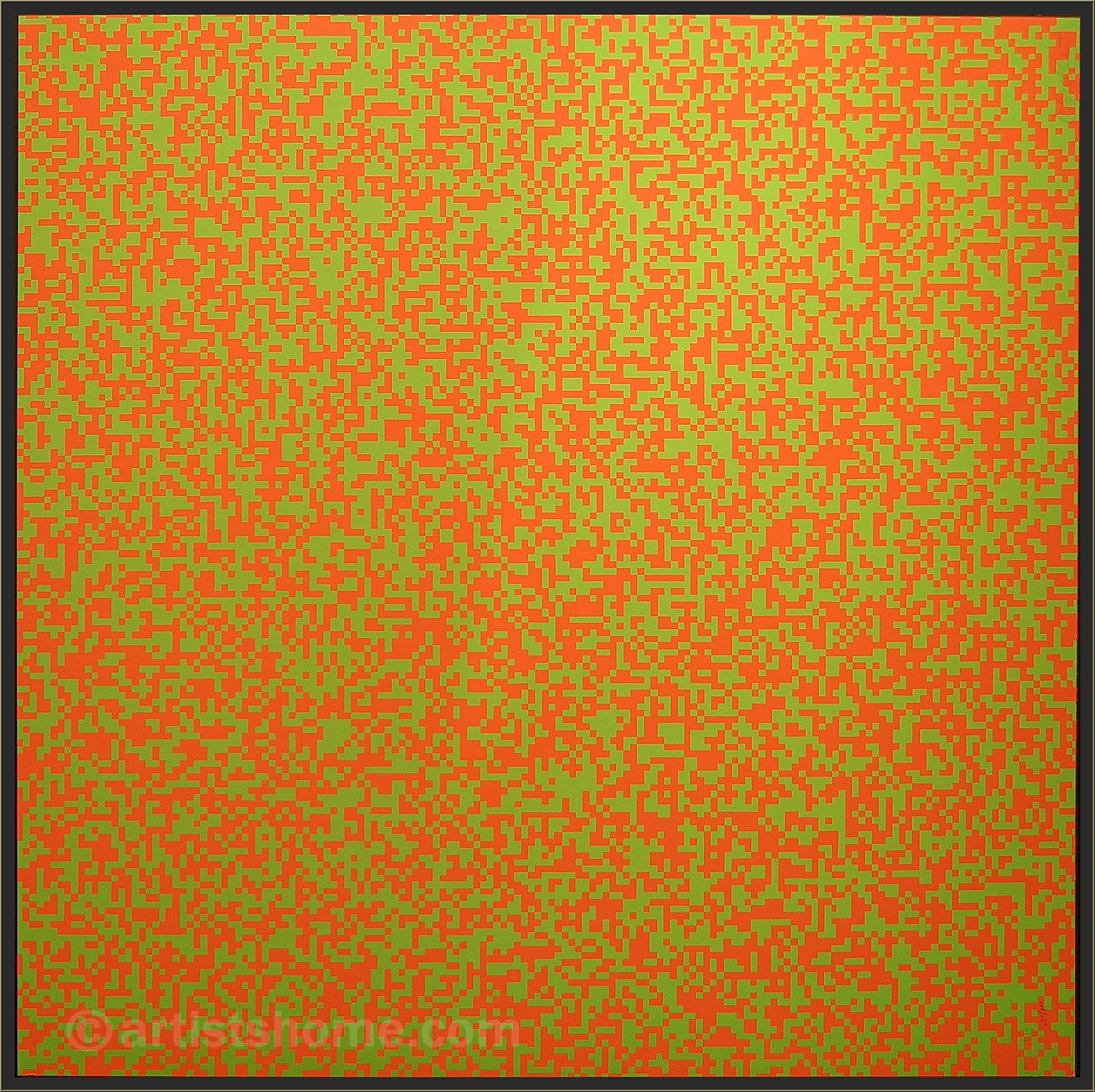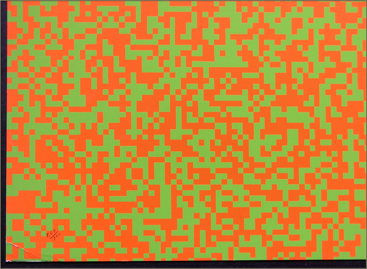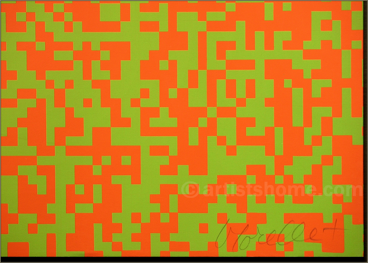 Détails :« 40.000 carrés » en orange vif et vert clair - Modèle d'exposition (légères traces) à prix réduit Superbe sérigraphie couleur de valeur muséale composée de milliers de minuscules carrés orange et verts clairs. L'estampe est signée par l'artiste et numérotée. Cette sérigraphie est basée sur l'œuvre « 40000 carrés » réalisée en 1962 par François Morellet et qui lui a valu une importante notoriété dans le monde entier. Et pour cause, sa peinture était faite de quarante mille carrés bicolores répartis au hasard de la consultation d'un annuaire téléphonique. Composée d'un gigantesque cadrillage, chaque carré recevait l'une ou l'autre couleur de manière binaire selon que les numéros de téléphone sélectionnés étaient pairs ou impairs. Les deux couleurs ont été choisies pour leur grande différence d'intensité, créant ainsi un effet de vibration selon la distance de l'œuvre à laquelle on se place. Frissons garantis ! L'intensité est telle que prendre la sérigraphie en photo n'a pas été une mince affaire. Inutile de vous dire que la photo ne rend pas parfaitement la qualité de l'œuvre. Une estampe pour collectionneurs ambitieux !