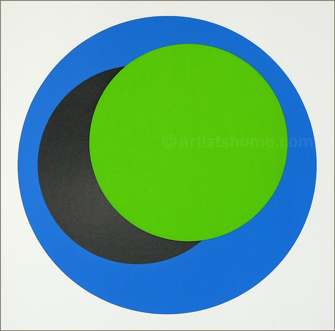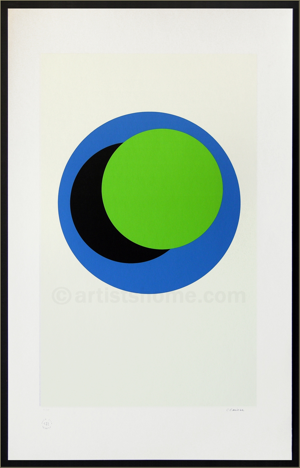 Détails :« Cercles » bleu, noir et vert sur blanc, 1967 Oeuvre d'art abstrait de Geneviève Claisse sur le thème « cercle » - disques dans des tons vifs sur fond blanc. Épreuve signée et numérotée par l'artiste, editée par Denise René.