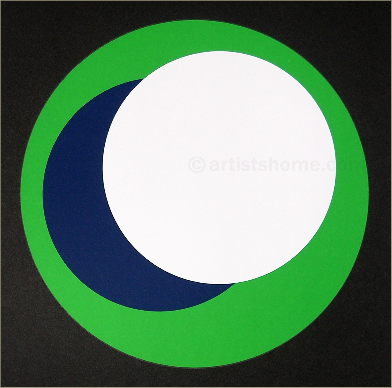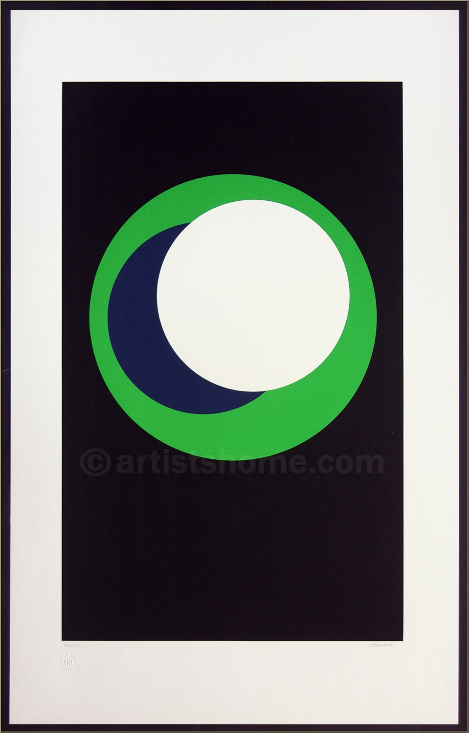 Détails :« Cercles » blanc, bleu foncé et vert, surface noir, 1967 Oeuvre d'art abstrait de Geneviève Claisse sur le thème « cercle » - disques vert, bleu et blanc sur fond noir. Épreuve signée et numérotée par l'artiste, editée par Denise René.