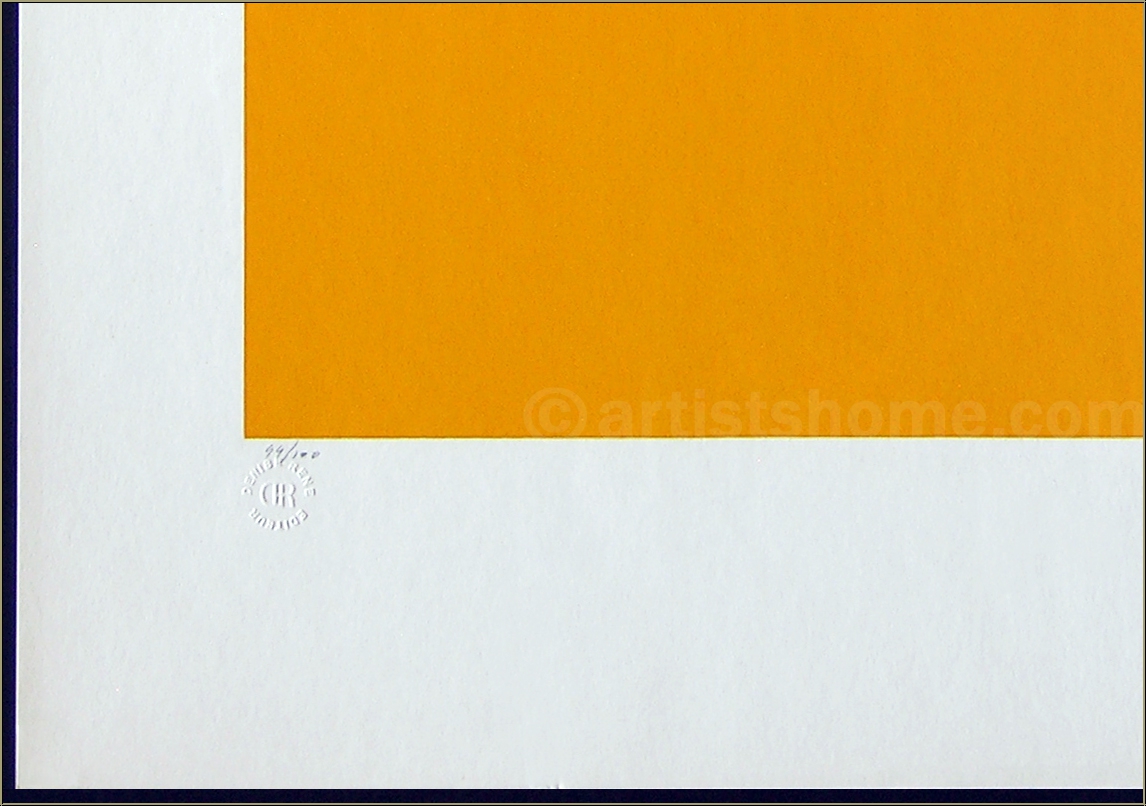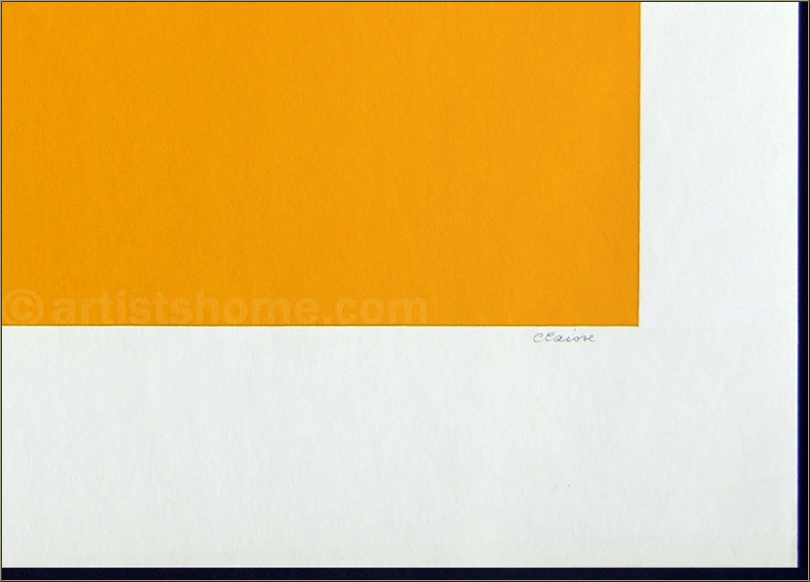 Détails :« Cercles » orange, blanc et noir sur fond jaune, 1967 Oeuvre d'art abstrait de Geneviève Claisse sur le thème « cercle » - disques noir, blanc et orangé foncé sur fond jaune chaud. Épreuve signée et numérotée par l'artiste, editée par Denise René.