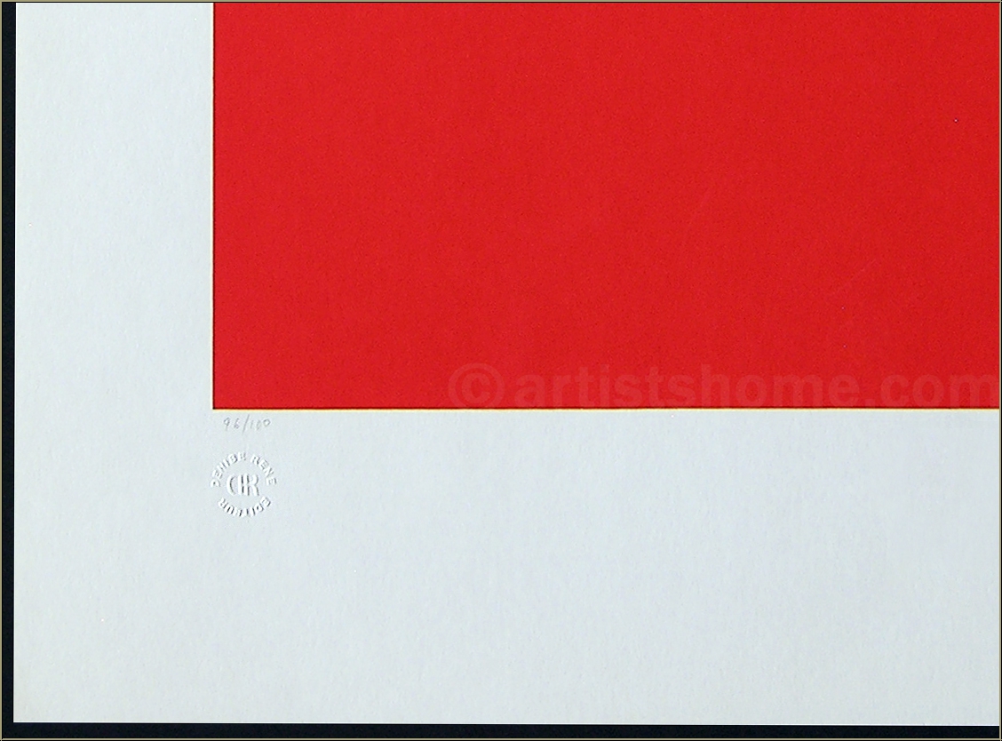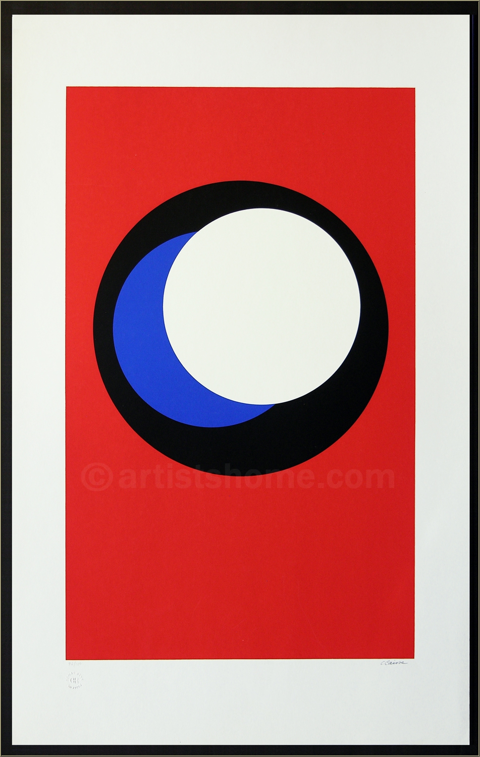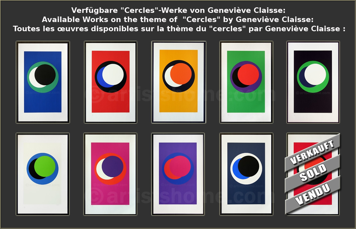 Détails :« Cercles » noir, bleu et blanc sur fond rouge, 1967 Oeuvre d'art abstrait de Geneviève Claisse sur le thème « cercle » - disques blanc, bleu et noir sur fond rouge. Épreuve signée et numérotée par l'artiste, editée par Denise René.