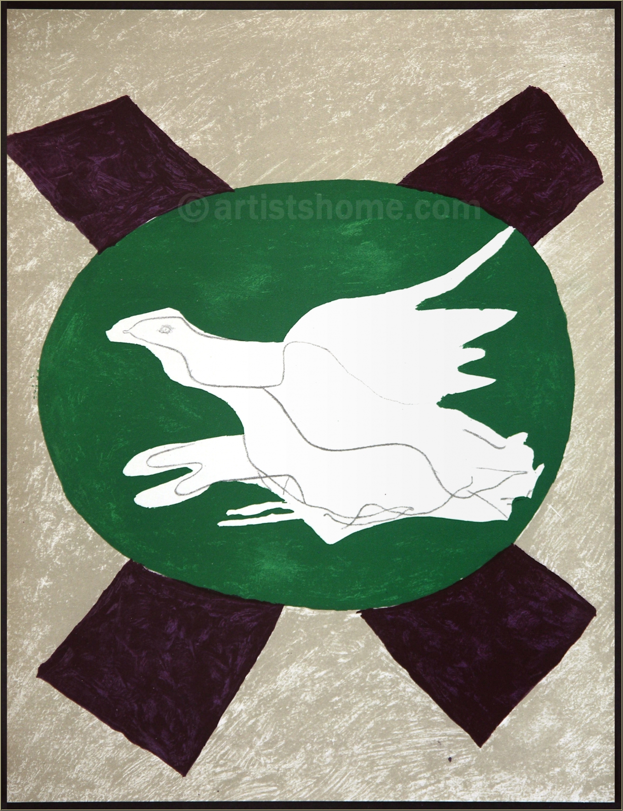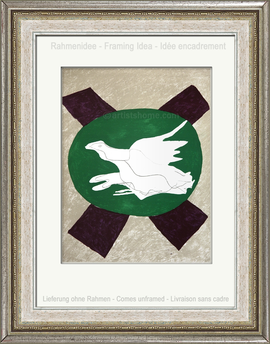 Détails :« Oiseau sur fond de X » En 1958, Georges Braque a créé deux estampes originales – une gravure et une lithographie. Sur chacune d’entre elle, il a tout d’abord conçu un oiseau blanc tourné vers la gauche dans un ovale de couleur, qu’il a ensuite placé devant un « X » prononcé. La signification que ce symbole ambivalent avait pour Braque reste cependant obscure.
