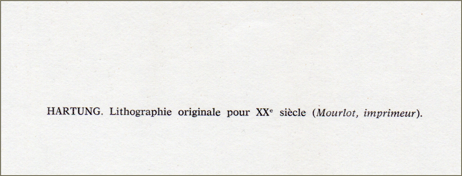 | | « L 127 », 1964 Composition abstraite en noir sur fond turquoise pour le numéro « Permanence du sacre » du magazine « XXè Siècle », imprimée par Mourlot. | Dimensions : | 31 x 24 cm (feuille) | | Tirage : | une des 2.000 épreuves de l'édition limitée, non signée | | Remarques : | Texte au verso : « Hartung. Lithographie originale pour XXè siècle (Mourlot, Imprimeur). » | | Éditeur : | Société Internat. d'Art XXè siècle, Paris | | Imprimeur : | Mourlot, Paris | | Référence : | Mason, Rainer Michael. Hans Hartung. Les estampes - Die Druckgraphik - The prints. Fondation Hans Hartung et Anna-Eva Bergman, 2010, n° 205 Une preuve d'identité de l'œuvre sera fournie (sans prix dans le cas d'un cadeau). | | État : | Details En parfait état de conservation. Cadre non fourni. | Évaluations des clients : Il n'y a pas encore d'evaluations. Seulement les client qui ont acheté cet article et qui sont connecté peuvent l'evaluer. Votre nom est automatiquement affiché de manière anonyme, par ex. « Olivier M., France ».  *Valent pour les livraisons vers l'Allemagne payées via PayPal. En cas de paiement par virement bancaire, la livraison prendra un à trois jours de plus à partir du jour du virement en question. Pour connaître les délais de livraison pour d’autres pays et estimer le jour de livraison, rendez-vous ici |