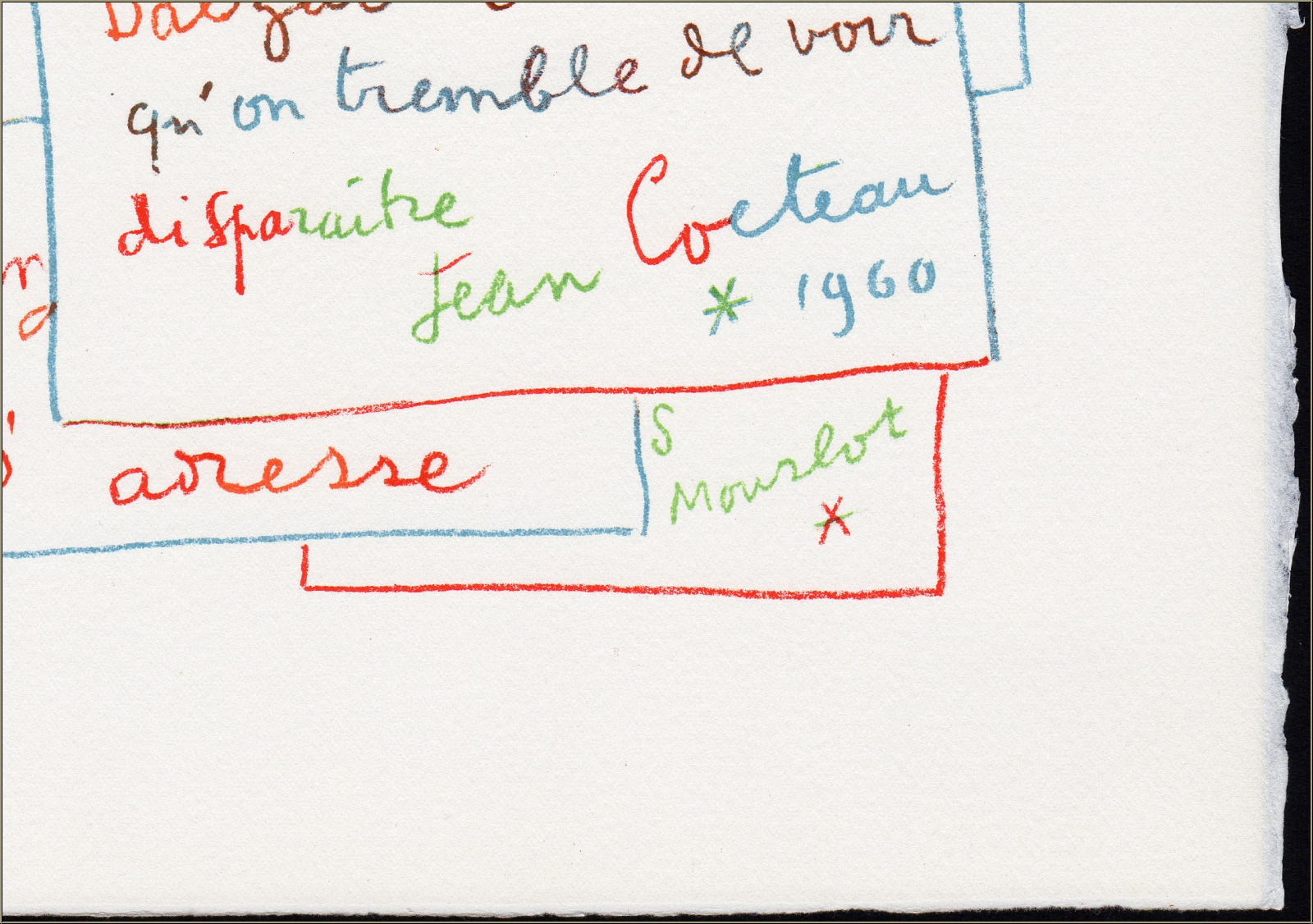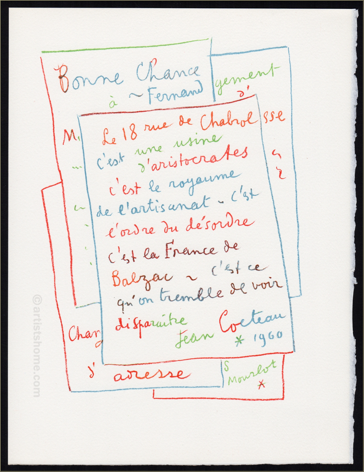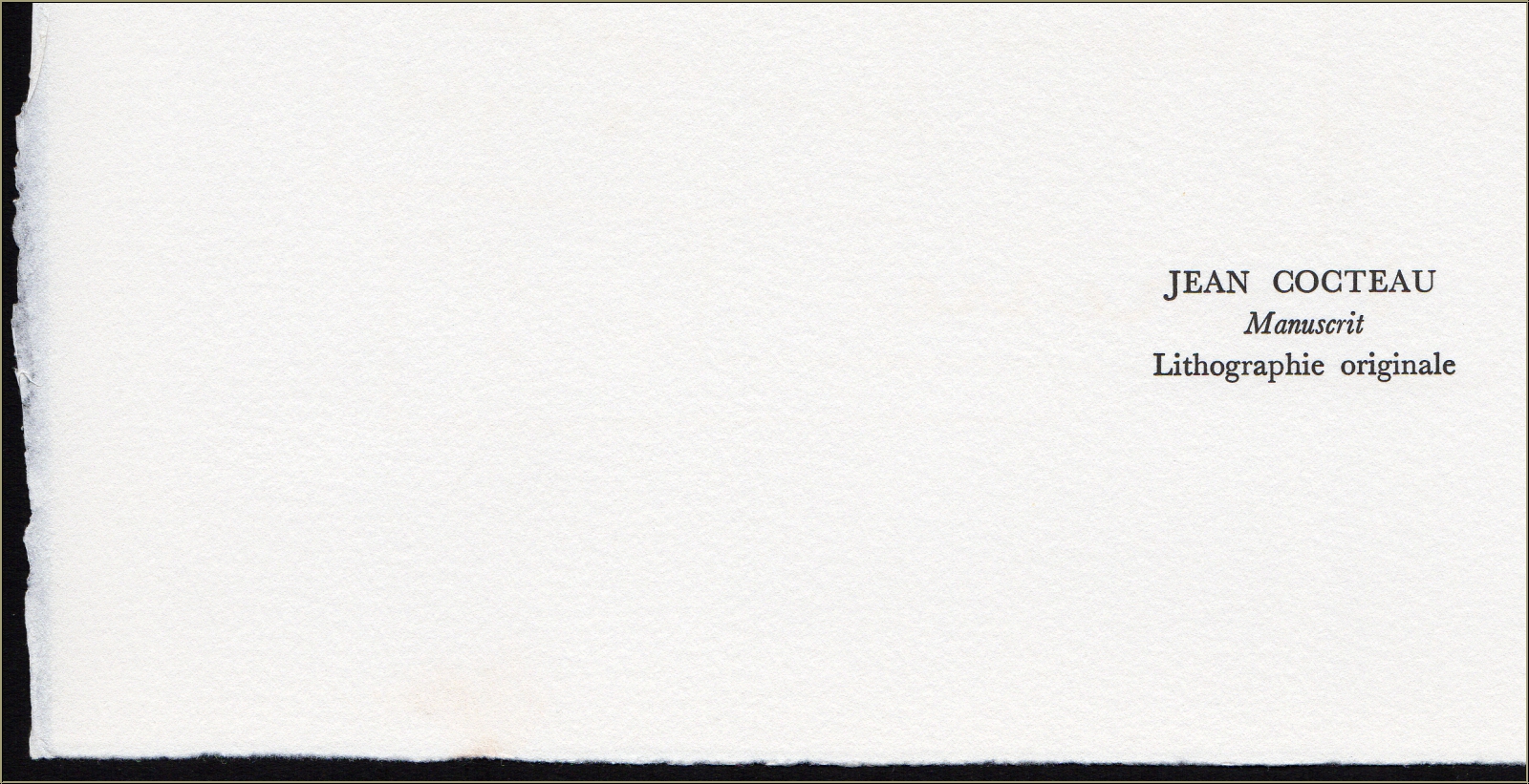 | | « Manuscrit » Un des 800 exemplaires de l'édition limitée sur papier Arches pour « Souvenirs et portraits d'artistes » | Technique : | Lithographie originale en couleurs, signée et datée dans la pierre. Texte au verso : « Jean Cocteau - Manuscrit - Lithographie originale » Ceci n'est pas une reproduction récente (tirage d'art) qui a été copiée selon des procédés de reproduction photomécanique, mais la lithographie originale de 1960, publiée en 1972 ! | | Année de réalisation : | 1972 (publication), 1960 (création) | | Formats : | 32,5 x 25 cm (feuille) | | Tirage | Papier : | Une des 800 épreuves non signées de l'édition limitée sur papier Arches | | Éditeur : | Alain C. Mazo, Paris u. Léon Amiel, New York, 1972 | | Imprimeur : | Mourlot, Paris | | Référence : | cf. https://mourlot.com « Livres de Fernand Mourlot » | | État : | Details En parfait état de conservation ! Cadre non fourni. | Évaluations des clients : Il n'y a pas encore d'evaluations. Seulement les client qui ont acheté cet article et qui sont connecté peuvent l'evaluer. Votre nom est automatiquement affiché de manière anonyme, par ex. « Olivier M., France ».  *Valent pour les livraisons vers l'Allemagne payées via PayPal. En cas de paiement par virement bancaire, la livraison prendra un à trois jours de plus à partir du jour du virement en question. Pour connaître les délais de livraison pour d’autres pays et estimer le jour de livraison, rendez-vous ici |