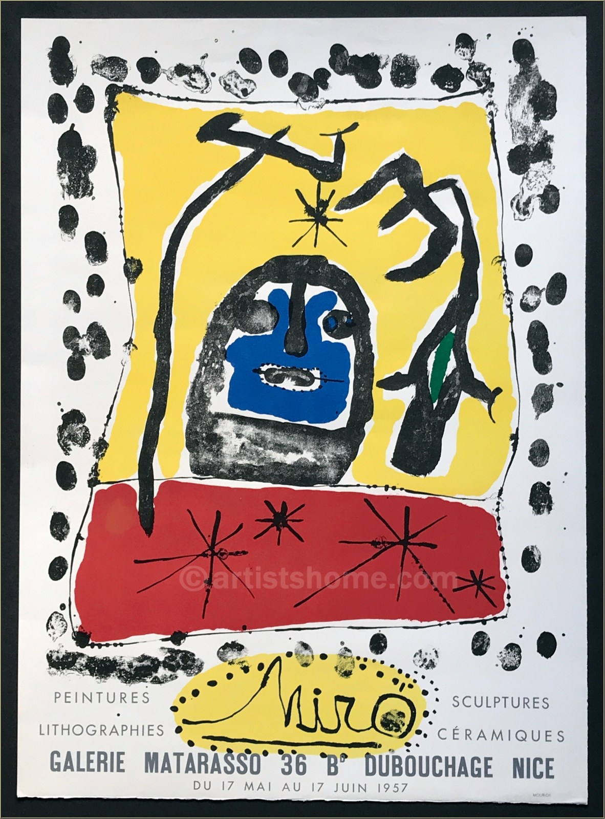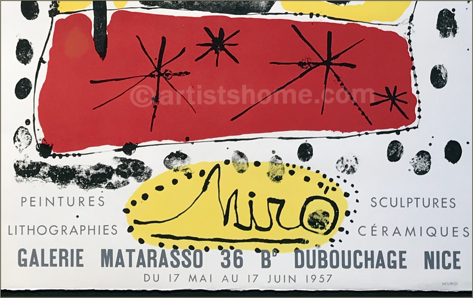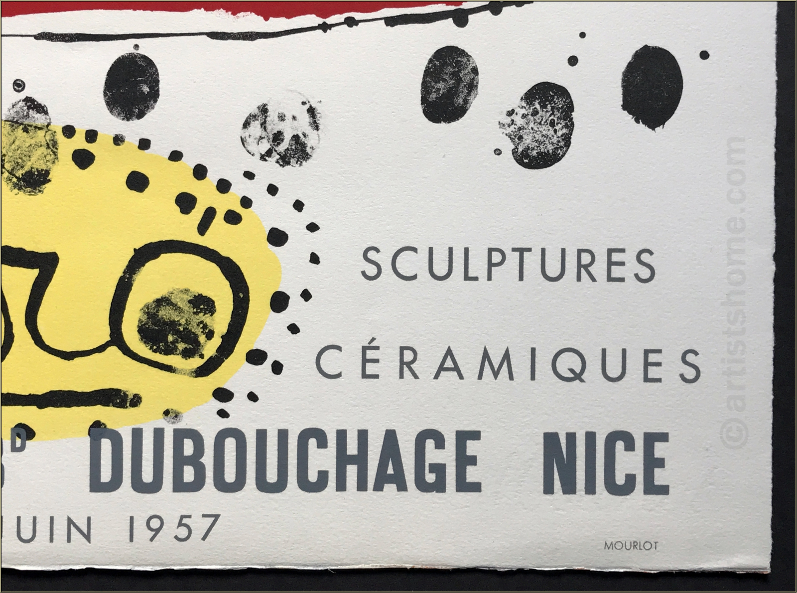 Détails :"Miro: Peintures - Sculptures - Lithographies - Céramiques", 1957 Lithographie originale sur papier Arches filigrané pour une affiche d'exposition, conçu par Miró lui-même et imprimée par Mourlot.