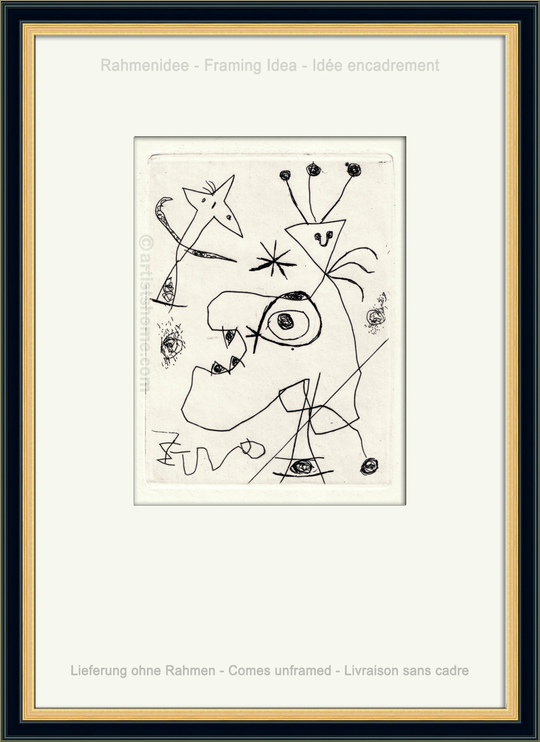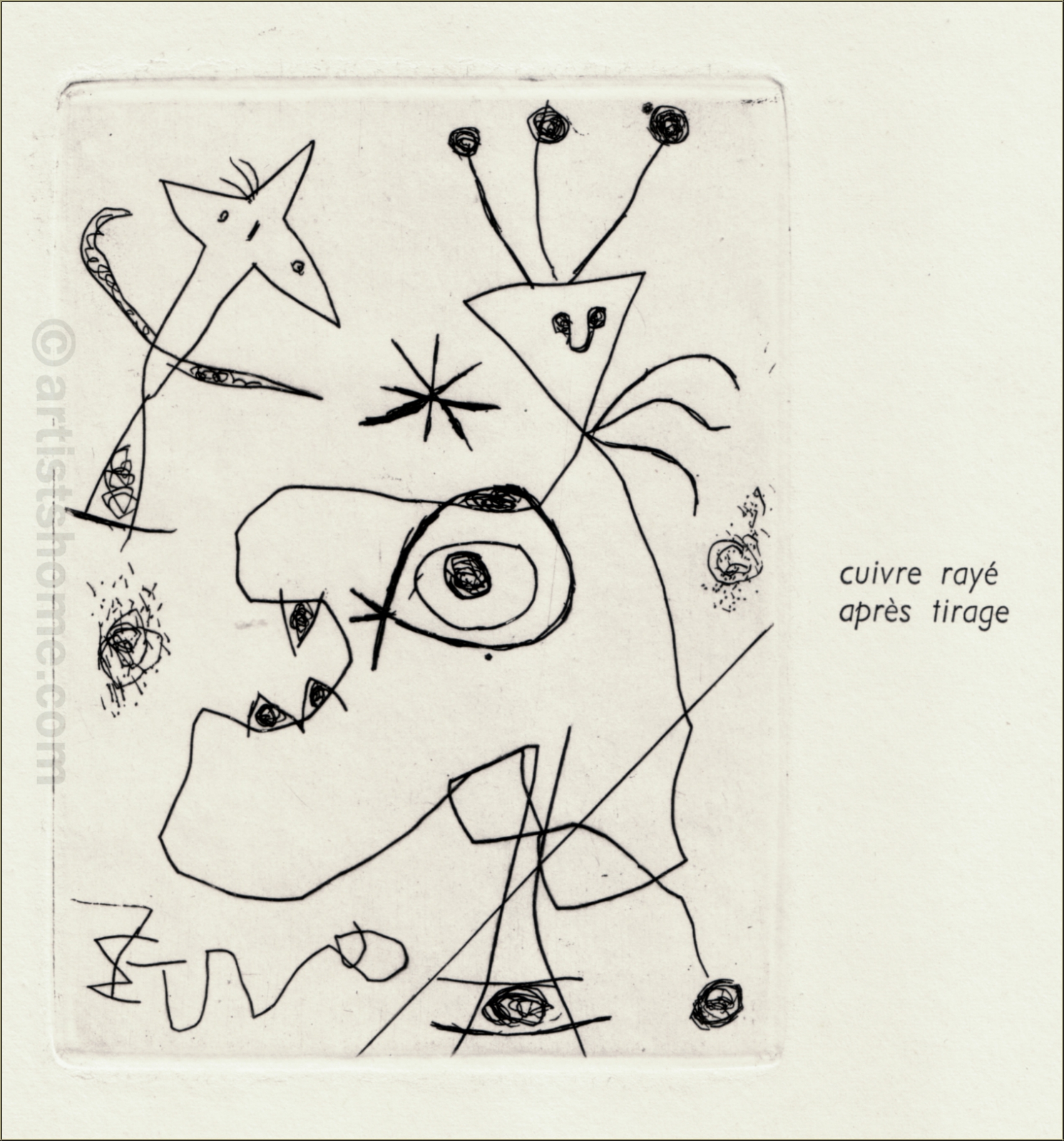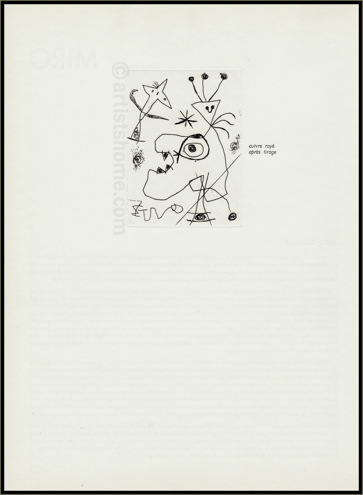 | | « L'Aigrette » 1956 Gravure à l'eau-forte originale de Joan Miró pour « 10 ans d'édition 1946-1956 », Maeght, Paris. | Tirage / année de réalisation: | Une des env. 1000 épreuves non signées, 1956. La gravure a été tirée séparément sur vélin d'Arches à 30 exemplaires, numérotées et signées par l'artiste. | | Dimensions: | 37,5 x 28 cm (papier) - 12 x 9 cm (cuivre) | | Éditeur(s): | Maeght, Paris | | Imprimeur: | Crommelynck et Dutrou, Paris | | Annotations: | Imprimée au recto ("cuivre rayé après tirage") et au verso, comme tout le tirage de 1956 | | Référence: | Dupin, Jacques. Miró Graveur (tome I), Daniel Lelong Éditeur, 1984, p. 98-99, n° 105 Une photocopie du catalogue raisonné sera fournie. Vous recevrez, de plus, une preuve d'identité de l'œuvre (sans prix dans le cas d'un cadeau). | | État: | Details En très bon état de conservation. Livraison non encadré. | | | Évaluations des clients : Il n'y a pas encore d'evaluations. Seulement les client qui ont acheté cet article et qui sont connecté peuvent l'evaluer. Votre nom est automatiquement affiché de manière anonyme, par ex. « Olivier M., France ».  *Valent pour les livraisons vers l'Allemagne payées via PayPal. En cas de paiement par virement bancaire, la livraison prendra un à trois jours de plus à partir du jour du virement en question. Pour connaître les délais de livraison pour d’autres pays et estimer le jour de livraison, rendez-vous ici |