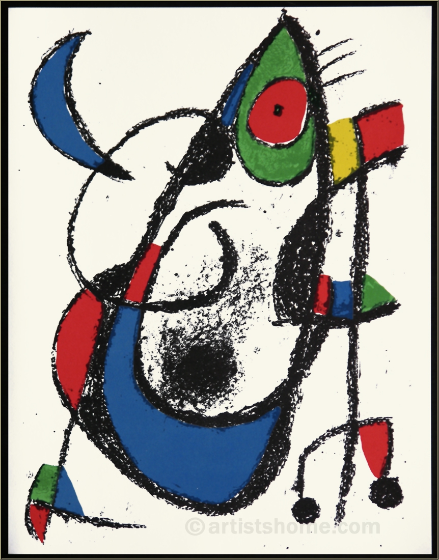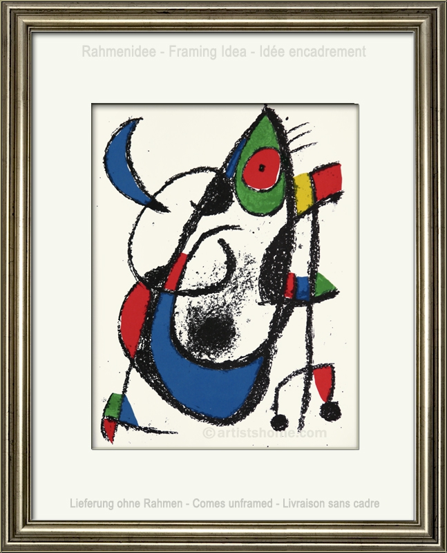 Détails :« Lithographie originale XI », sans titre, motif du dessin : une petite souris qui admirait la lune Comme souvent, Miró n'a pas donné de titre à cette estampe ; ses amateurs en ont donc inventé eux-mêmes pour pouvoir parler aux autres d'une certaine œuvre en évoquant son nom. Ici, l'on reconnaît les petites oreilles typiques du chat et la tête ronde d'un chat avide d'aventures qui a l'air de s'ennuyer.