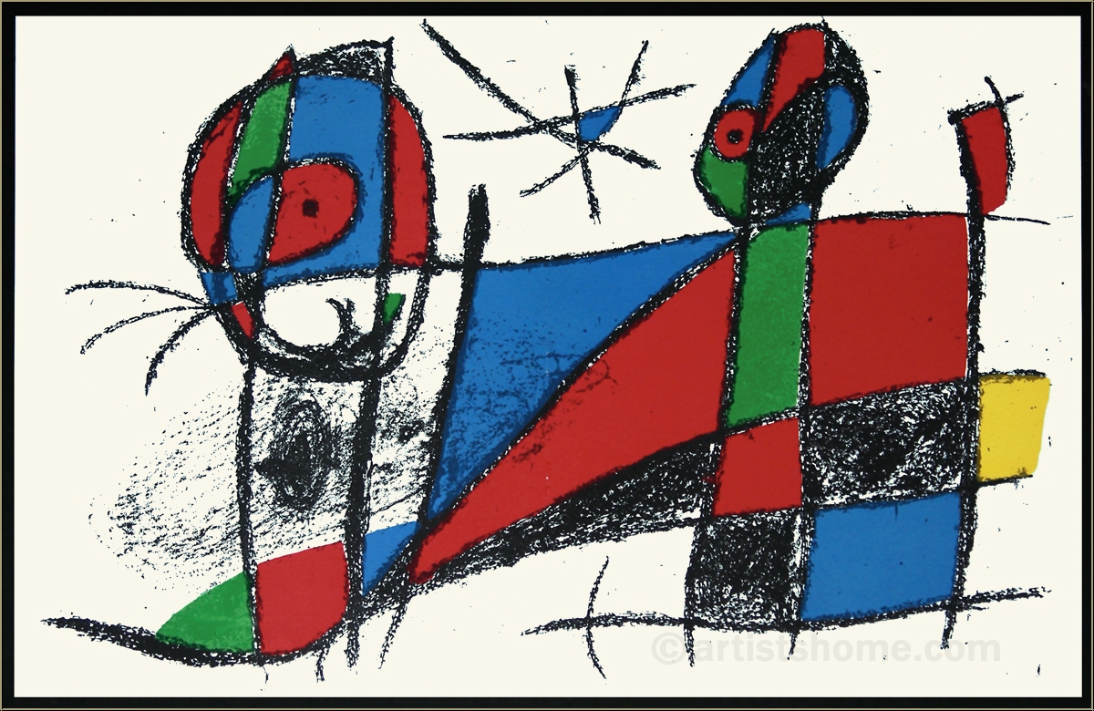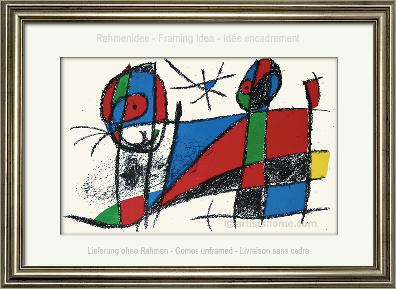 Détails :« Lithographie originale VI », sans titre, motif du dessin : Un chat heureux Un chat heureux se remarque aisément à cela : il s'étire voluptueusement et abondamment avant de partir en vadrouille. Les moustaches sont un détail de plus qui nous incite à penser qu'il s'agit-là d'un chat à la Miró et non pas d'un sphinx couché. Il faut dire que dans les dessins de l'artiste catalan, la frontière entre les êtres réels et les créatures imaginaires est inexistante, toutes les formes et toutes les couleurs fusionnent pour donner un tout généralement convivial et joyeux. Cette estampe n'a besoin d'aucun titre puisque c'est à nous de lui en donner un dès lors que nous comprenons le langage de Miro à travers ses dessins.