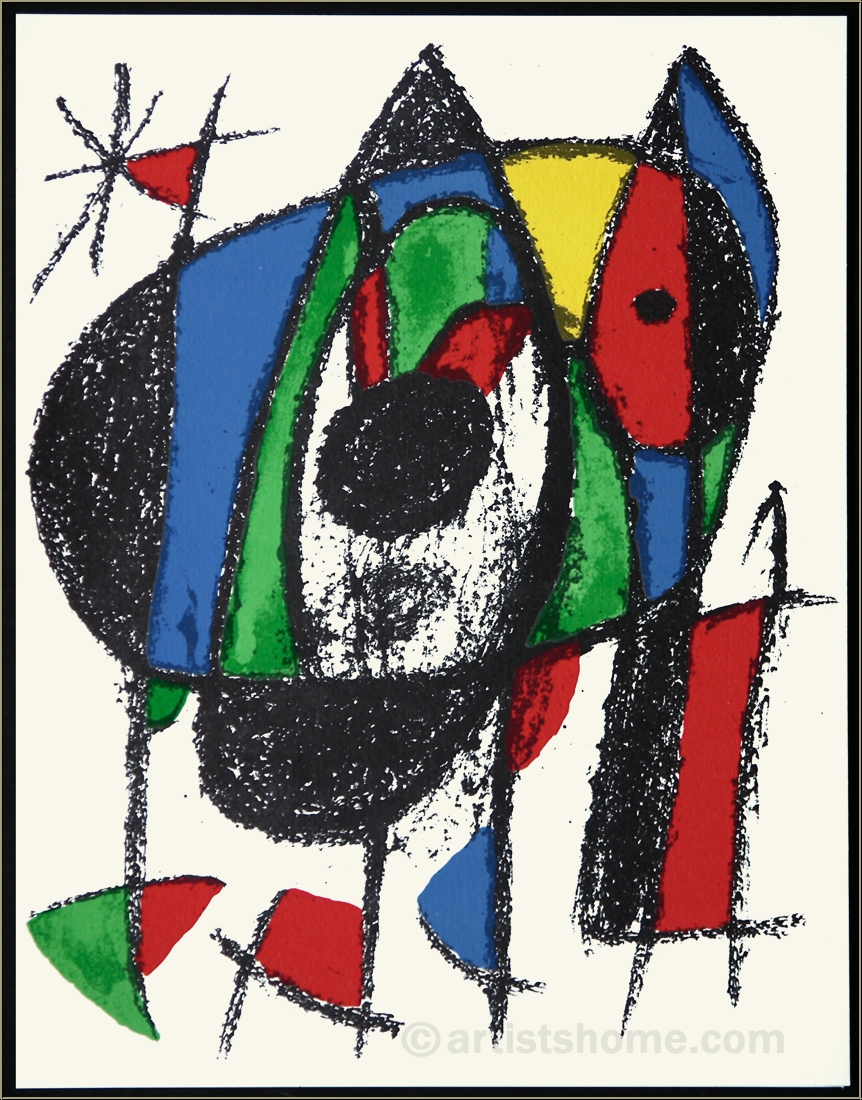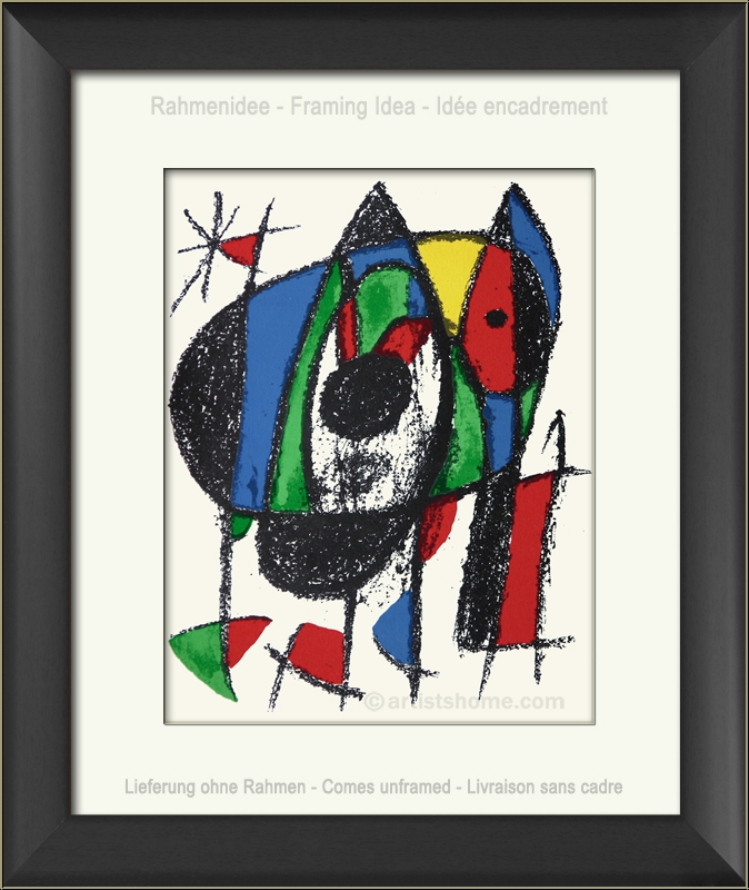 Détails :« Lithographie originale V », sans titre, motif du dessin : Chat Le chat aventureux au regard triste peut aussi être un petit chien qui mendie, plein d'espoir avec ses oreilles dressées. Peu importe les associations que vous faites avec les lignes, les formes et les couleurs et que vous tissez grâce à votre imagination, elles auraient forcément convenu à Joan Miró. Stimuler l'imagination en renonçant à donner un titre à ses dessins : telle était sa façon d'entrer en contact de manière plaisante avec les gens pour lesquels il réalisait ses œuvres.