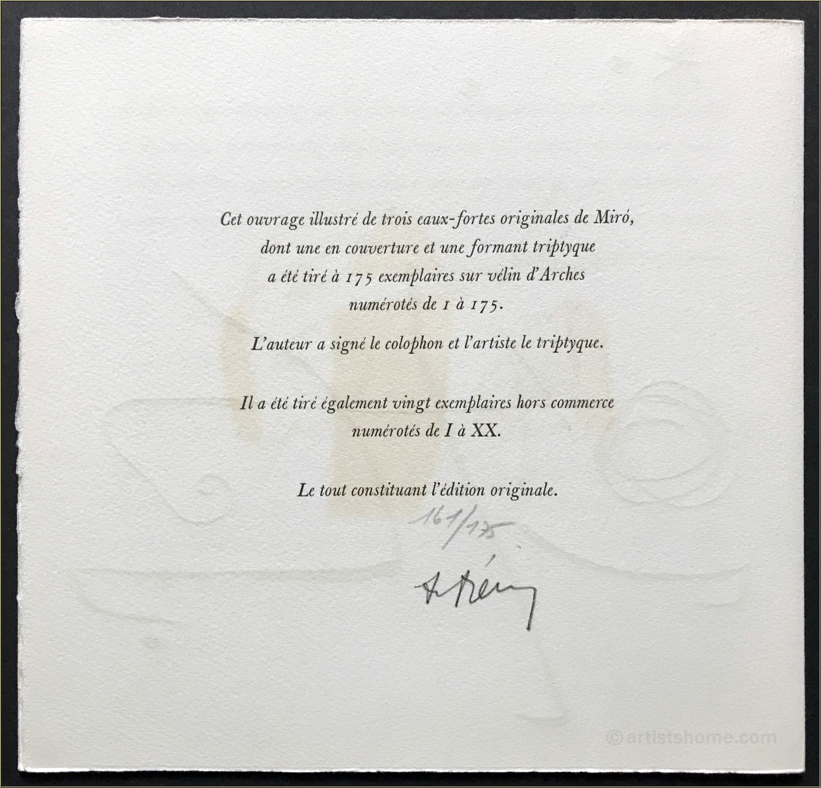 | | Livre d'artiste recherché, avec 2 eaux-fortes originales en couleurs sur papier Arches.. | | Description: | Maeght éditeur - Grandes éditiones originales illustrées : tirée à 175 exemplaires sur vélin d'Arches. L'ouvrage est illustré de trois (ici: deux, sinon complet) eaux-fortes originales en couleurs de Joan Miro, dont une en couverture. 28 pages. Boîte de protection en toile jaune. L'auteur a signé le colophon, numéroté 161/175. | | Dimensions: | 27,5 x 28 cm (étui) | | Signée: | Un des 175 exemplaires, celui-ci numéroté 161/175, André Frénaud a signé le colophon | | Éditeur: | Maeght Éditeur, Paris | | Référence: | L'univers d'Aimé et Marguerite Maeght, Fondation Maeght, Saint-Paul, 1982, p. 272, et Cramer 234. | | État: | Details Très bel exemplaire. La boîte de protection légèrement empoussiérée, sinon en très bon état. | | Évaluations des clients : Il n'y a pas encore d'evaluations. Seulement les client qui ont acheté cet article et qui sont connecté peuvent l'evaluer. Votre nom est automatiquement affiché de manière anonyme, par ex. « Olivier M., France ».  *Valent pour les livraisons vers l'Allemagne payées via PayPal. En cas de paiement par virement bancaire, la livraison prendra un à trois jours de plus à partir du jour du virement en question. Pour connaître les délais de livraison pour d’autres pays et estimer le jour de livraison, rendez-vous ici |
