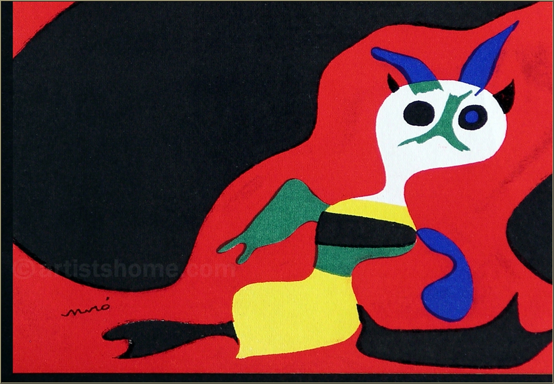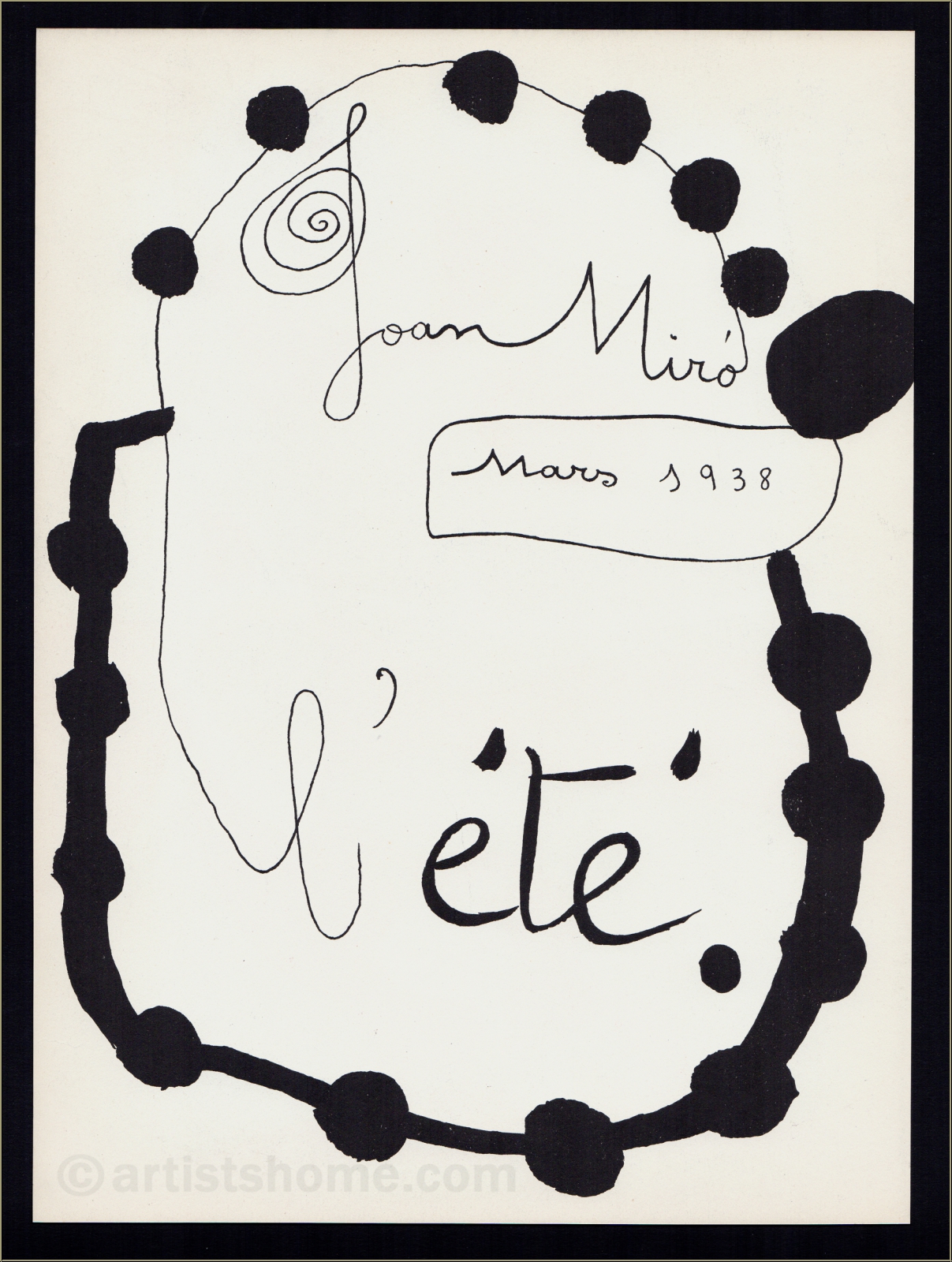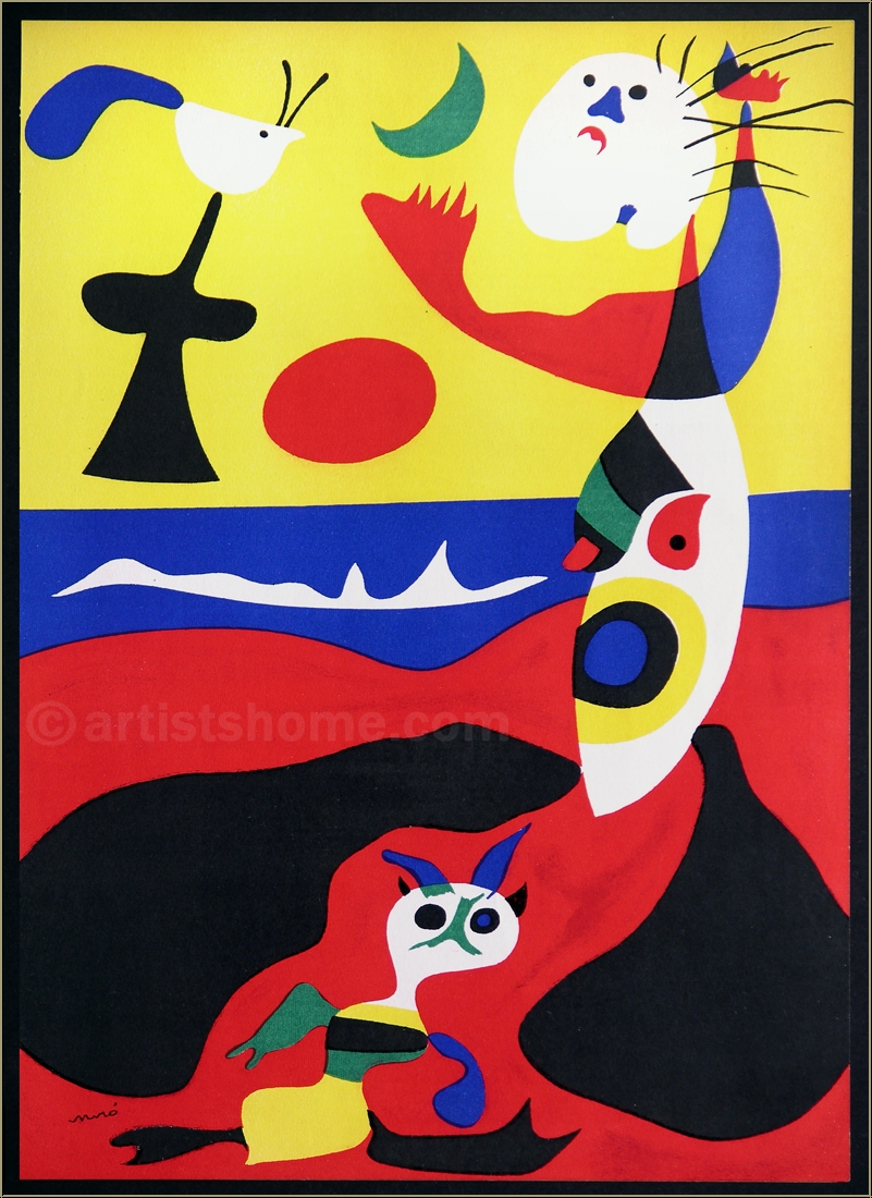 Détails :"L'été" - 1938 Sur les dessins que l'artiste catalan a réalisés pendant la guerre civile espagnole, l'agression et la douleur se lisaient sur le visage de ses personnages. Cette estampe originale réalisée en mars 1938, « L'été », est à mille lieux de la scène estivale idyllique, si ce n'est les couleurs utilisées, typiques de Miró. La peur, le désespoir et la colère caractérisent ces « dessins sauvages », comme Miró aimait à appeler lui-même les œuvres qu'il a réalisées à cette époque. Il n'a pas été le seul à maudire cette guerre à travers ses dessins ; son compatriote d'artiste Picasso a également dépeint le désespoir que lui a inspiré cette période dans son célèbre « Guernica ». Il est essentiel que l'art contre la guerre, aussi indigeste qu'il puisse être pour celui qui en contemple les œuvres, reçoive le soutien du public à toute époque ! C'est pourquoi nous venons de faire un don à l'aide aux réfugiés syriens apportée par l'ONU, parce que nous partageons votre vision et celle de Miró.