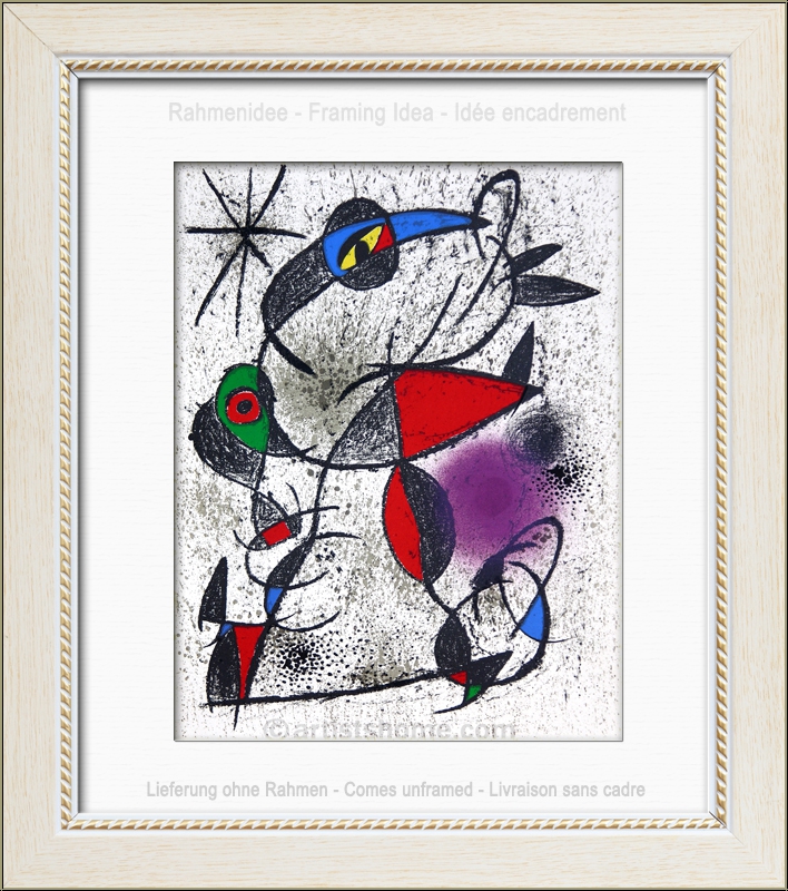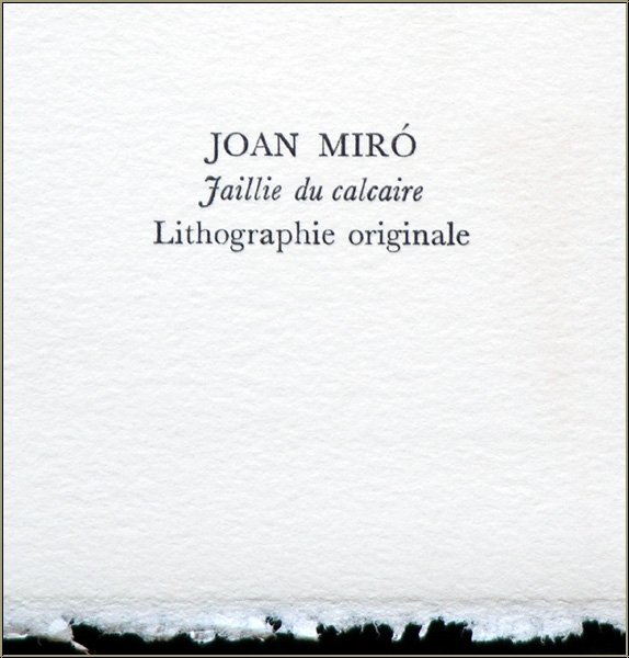 | | « Jaillie du calcaire » Un des 800 exemplaires de l'édition limitée sur papier Arches. | Technique : | Lithographie originale en couleurs, imprimée par Mourlot Ceci n'est pas une reproduction photomécanique (impression offset), mais la lithographie originale, selon le catalogue raisonné ! ATTENTION: il semble actuellement que des impressions d'apparence similaire sont disponibles à la vente sur internet. Il s'agit de réimpressions non autorisées (des copies pirates). Ces tirages ne sont pas des lithographies originales ! | | Année de réalisation : | 1972 | | Formats : | 32,5 x 25 cm (feuille) | | Tirage | Papier : | Une des 800 épreuves de l'édition limitée sur papier Arches, non signée | | Éditeur : | Alain C. Mazo, Paris u. Léon Amiel, New York, 1972 | | Imprimeur : | Mourlot, Paris | | Référence : | Joan Miró. Der Lithograph Bd. IV, 1969-1972, Maeght Paris 1982, Weber Genève, page 193, n° 850, cf. https://mourlot.com "Livres de Fernand Mourlot" Une photocopie du catalogue raisonné sera fournie. Vous recevrez, de plus, une preuve d'identité de l'œuvre (sans prix dans le cas d'un cadeau). | | État : | Details En parfait état de conservation. Cadre non fourni. | Évaluations des clients : Il n'y a pas encore d'evaluations. Seulement les client qui ont acheté cet article et qui sont connecté peuvent l'evaluer. Votre nom est automatiquement affiché de manière anonyme, par ex. « Olivier M., France ».  *Valent pour les livraisons vers l'Allemagne payées via PayPal. En cas de paiement par virement bancaire, la livraison prendra un à trois jours de plus à partir du jour du virement en question. Pour connaître les délais de livraison pour d’autres pays et estimer le jour de livraison, rendez-vous ici |