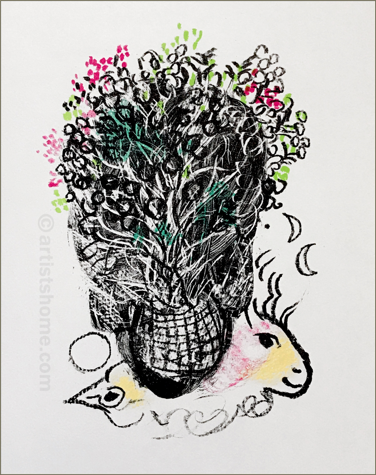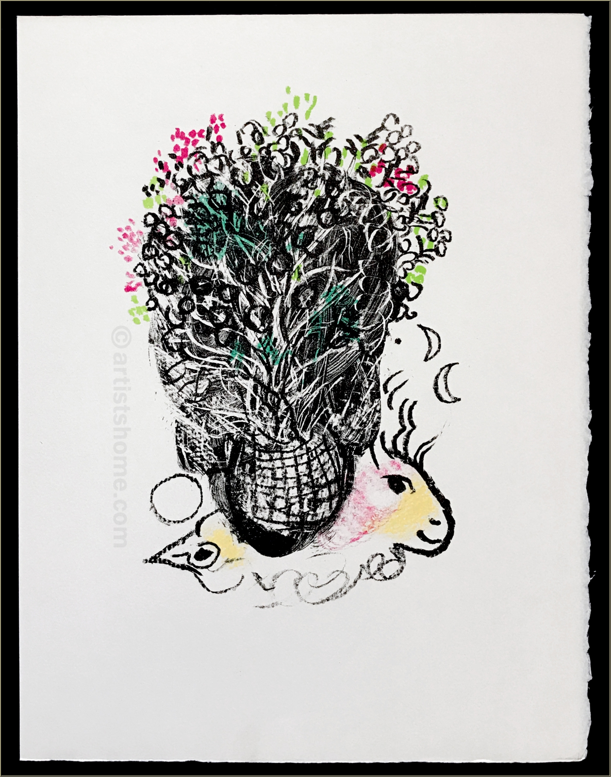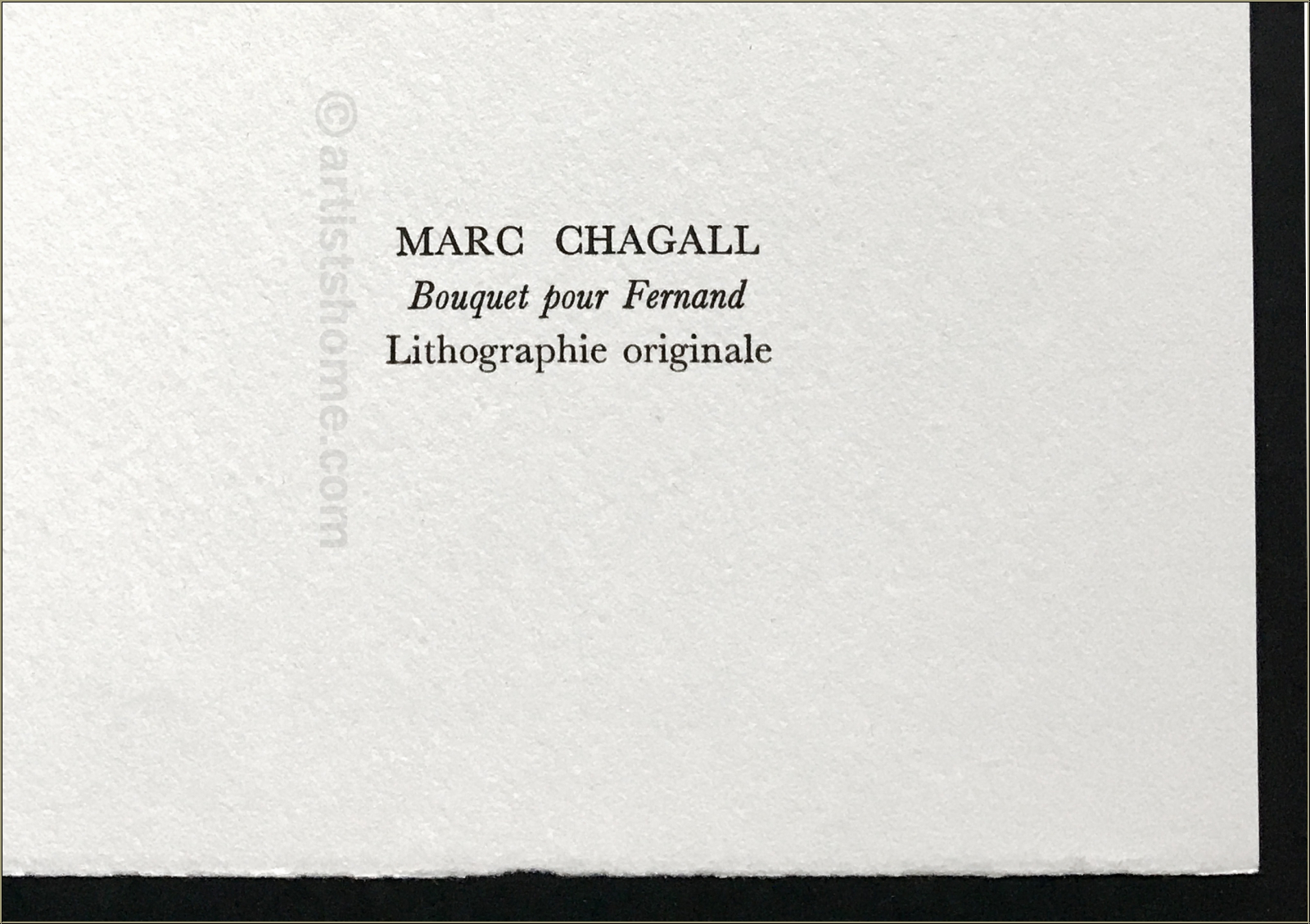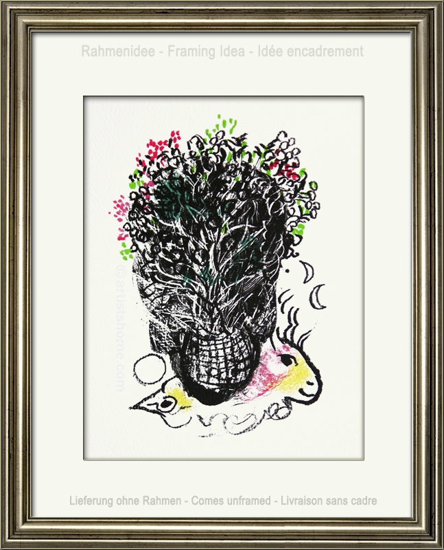 | | « Bouquet pour Fernand » Lithographie originale sur Arches de Marc Chagall pour « Souvenirs et portraits d'artistes », édition de luxe. Cet ouvrage dans lequel Fernand Mourlot raconte pour la première fois son métier d'imprimeur et ses rencontres avec les artistes est le livre de l'amitié. Ceci n'est pas une reproduction récente ou un retirage en offset (quadrichromie ou grano lithographie etc. d'une pseudo-édition limitée) mais la lithographie originale, selon le catalogue raisonné de Fernand Mourlot. ATTENTION: il semble actuellement que des impressions d'apparence similaire sont disponibles à la vente sur internet. Il s'agit de réimpressions non autorisées (des copies pirates). Ces tirages ne sont pas des lithographies originales ! | Année de réalisation: | 1972 pour « Souvenirs et portraits d'artistes », édition originale, 1971 pour la lithographie originale de Chagall | | Tirage: | Une des 800 épreuves non signées de l'édition limitée sur papier vélin d'Arches | | Dimensions du papier: | 32,5 x 25 cm | | Éditeur(s): | Alain C. Mazo, Paris, 1972 | | Imprimeur: | Mourlot, Paris | | Annotations: | Texte au verso: « Marc Chagall - Bouquet pour Fernand - Lithographie originale » | | Référence: | Mourlot, F., Chagall Lithograph [IV] 1969-1973, André Sauret, Monte Carlo 1974, p. 100, No. 635 [1971] cf. https://mourlot.com "Livres de Fernand Mourlot" Une photocopie du catalogue raisonné sera fournie. Vous recevrez, de plus, une preuve d'identité de l'œuvre (sans prix dans le cas d'un cadeau). | | État: | Details En parfait état de conservation ! Cadre non fourni. | | | Évaluations des clients : Il n'y a pas encore d'evaluations. Seulement les client qui ont acheté cet article et qui sont connecté peuvent l'evaluer. Votre nom est automatiquement affiché de manière anonyme, par ex. « Olivier M., France ».  *Valent pour les livraisons vers l'Allemagne payées via PayPal. En cas de paiement par virement bancaire, la livraison prendra un à trois jours de plus à partir du jour du virement en question. Pour connaître les délais de livraison pour d’autres pays et estimer le jour de livraison, rendez-vous ici |