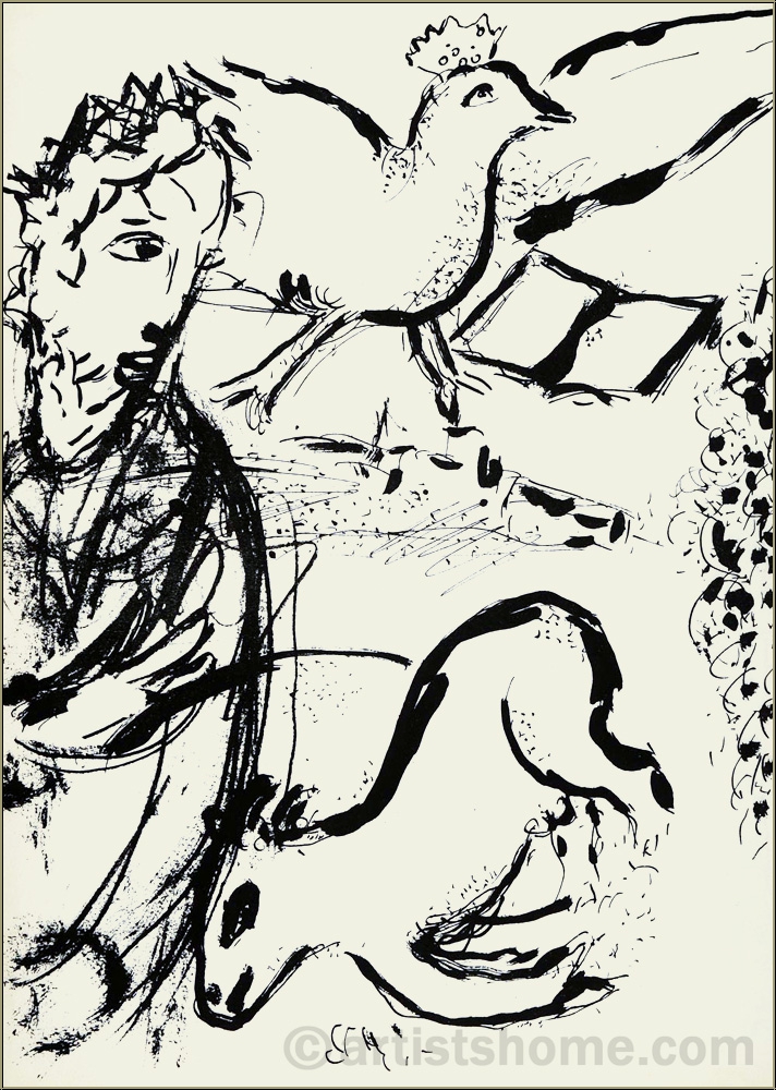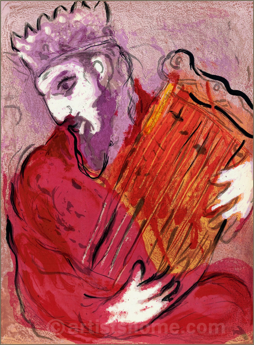 Détails :« David à la harpe » (Les Rois) David (vers 1000 av. J.C.) était sans aucun doute le plus grand roi de l'histoire du peuple juif. Il était un génie non seulement sur le plan politique, puisqu'il a réuni le royaume du Nord (Israël) et le Royaume de Sud (Juda), mais il était aussi un écrivain et un musicien de talent. On lui attribue une grande partie des psaumes : ces prières et chants qui ont été regroupés en un seul livre dans l'Ancien Testament. Sur cet œuvre, Chagall a représenté David avec sa harpe, qu'il jouait de main de maître. Il la tient délicatement dans les bras et semble songeur, comme perdu dans ses pensées. Son visage, blanc, est illuminé : est-ce le signe de l'illumination qu'il a reçue de Dieu ? On retrouve cette même couleur blanche dans ses mains, peut-être parce qu'il a aussi accompli ce que lui dictaient son cœur et son esprit. Le fond violet symbolise la présence de Dieu, le véritable roi qui règne sur Israël.