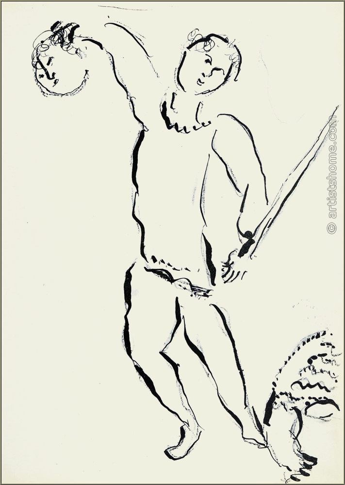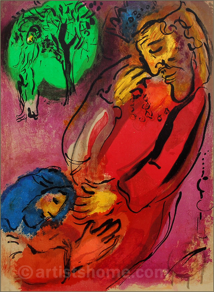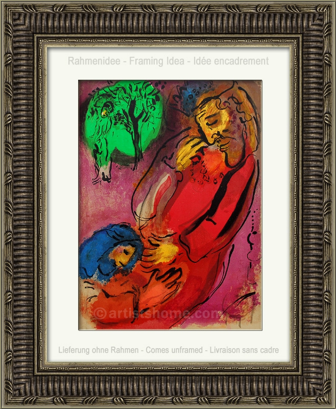 Détails :« David et Absalon » (Les Rois) Aucune autre œuvre de March Chagall n'est aussi généreuse en nuances intenses de rouge : un bon moyen de souligner le caractère dramatique de ce moment entre un père et son fils. Car, à travers cette œuvre, Chagall ne se contente pas de nous présenter le roi David regardant d'un air désolé son fils Absalon, qui est agenouillé devant lui, implorant son pardon...et qui le trahira bientôt à nouveau. Il représente également, en haut à gauche de cette estampe, la future mort tragique de ce fils dans la forêt d'Éphraïm, tué par les troupes de son père.
