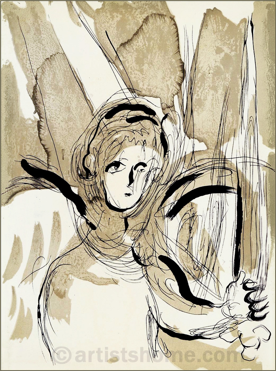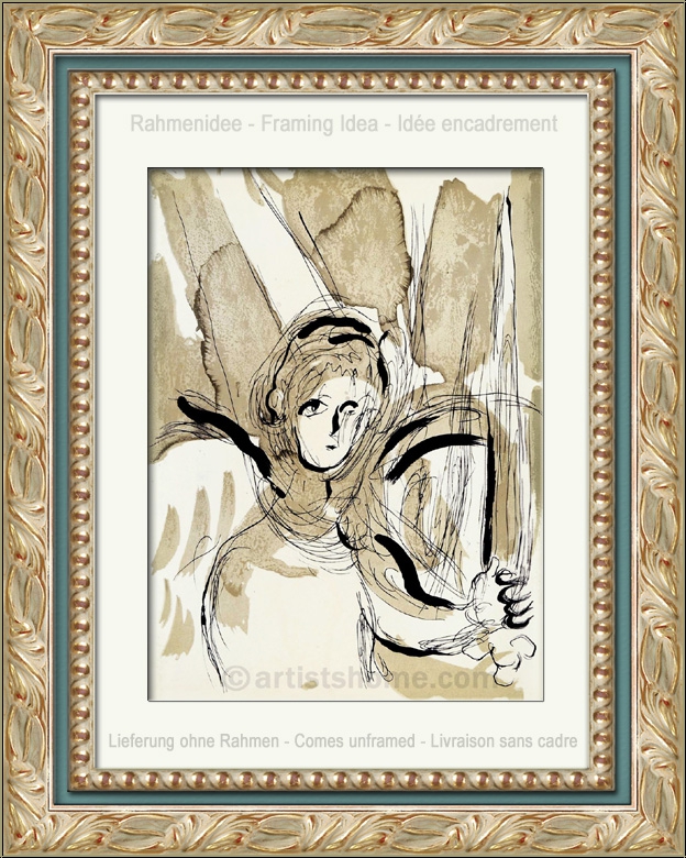 | | L'Ange à l'Épée Lithographie originale en couleurs de Marc Chagall pour "La Bible". Ceci n'est pas une reproduction récente ou un retirage (quadrichromie ou grano lithographie d'une "édition limitée") mais la lithographie originale, selon les catalogues raisonné. | Année de réalisation : | 1956 | | Tirage : | Une des 6500 épreuves de l'édition limitée sur papier vélin, non signée (la lithographie a été tirée séparément sur vélin d'Arches à 75 exemplaires, numérotées et signées). | | Dimensions : | 35 x 26 cm (feuille / illustration) | | Éditeur : | Éditions de la Revue Verve, Tériade, Paris, 1956 | | Imprimeur : | Mourlot, Paris | | Remarques : | Référence biblique: Psalm 91,11; Gen 3,24 | | Références : | Cain, J., et Mourlot, Fernand. Chagall Lithograph [I], André Sauret, Monte-Carlo 1960, p. 149-160, No. 119 Une photocopie du catalogue raisonné sera fournie. Vous recevrez, de plus, une preuve d'identité de l'œuvre (sans prix dans le cas d'un cadeau). | | État : | Details En parfait état de conservation ! Livraison non encadré. | | | Évaluations des clients : Il n'y a pas encore d'evaluations. Seulement les client qui ont acheté cet article et qui sont connecté peuvent l'evaluer. Votre nom est automatiquement affiché de manière anonyme, par ex. « Olivier M., France ».  *Valent pour les livraisons vers l'Allemagne payées via PayPal. En cas de paiement par virement bancaire, la livraison prendra un à trois jours de plus à partir du jour du virement en question. Pour connaître les délais de livraison pour d’autres pays et estimer le jour de livraison, rendez-vous ici |