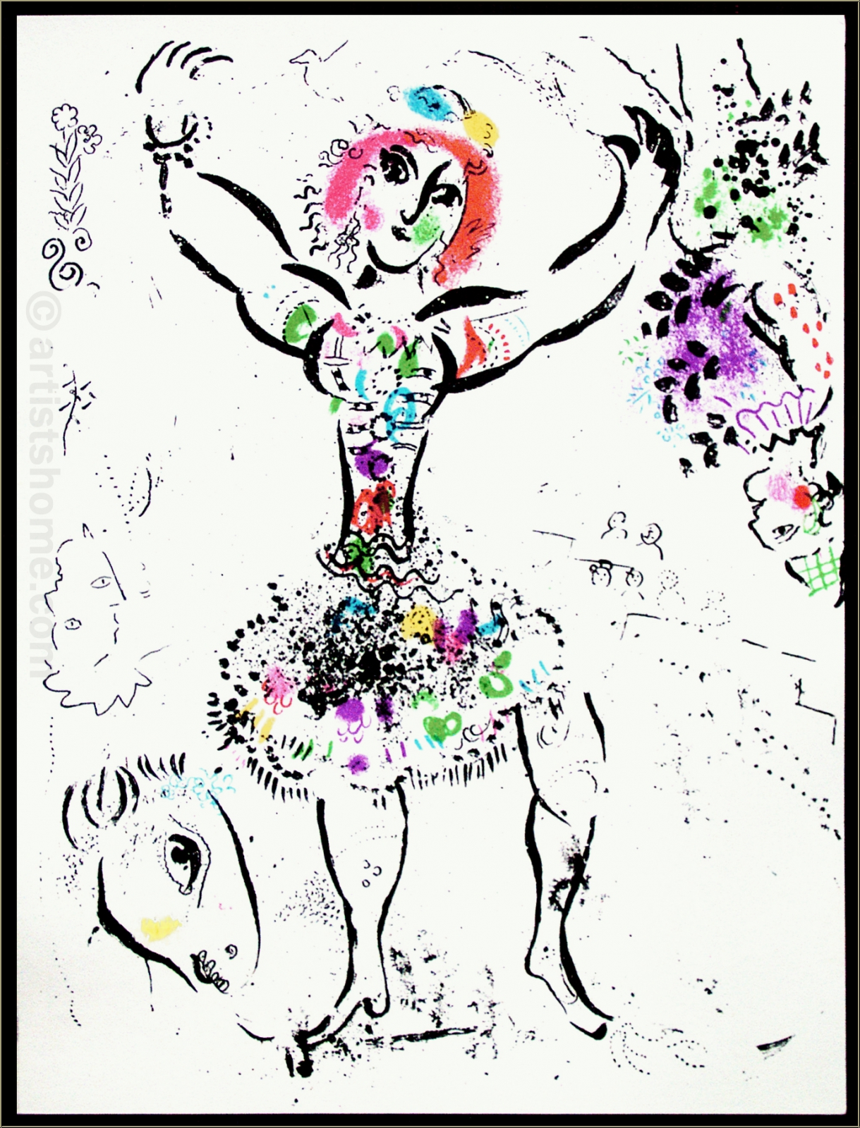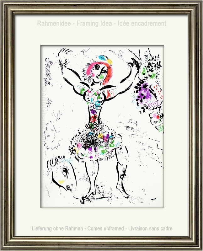 | | « La Jongleuse » (Mourlot 290) « Le jongleur » est une lithographie en couleur enchanteresse et particulièrement finement dessinée par Marc Chagall en 1960. Les protagonistes de cette œuvre sont une femme acrobate au centre, entourée de fleurs qui la décorent, et une tête d’âne en bas à gauche du dessin. Comme dans beaucoup de ses lithographies, Chagall accompagne le spectacle qu’il donne à voir ici de formes organiques comme des fleurs et des branches. Et il le fait avec une légèreté qui ressemble étroitement au jeu plein de joie du jongleur. Il ne cesse de créer une harmonie entre l’homme et l’animal. Des lignes d »un noir profond contrastent avec des couleurs douces. Le peintre de génie prête à la scène le parfait degré de joie et de dynamisme en utilisant des coups de pinceau individuels et riche en couleurs : magenta, vert, violet, jaune et bleu. C’est un spectacle visuel dont on ne se lasse pas. L’Arlequin à l’envers sur la droite de l’œuvre personnifie la folie du cirque que Chagall a aimé toute sa vie. Ceci n'est pas une reproduction récente ou un retirage (quadrichromie ou grano lithographie d'une "édition limitée") mais la lithographie originale de 1960, selon le catalogue raisonné de Mourlot. | Dimensions : | 32 x 24,5 cm (papier = illustration) | | Tirage/Support : | Une des épreuves non signées de l'édition limitée sur papier vélin, (la lithographie a été tirée séparément sur vélin d'Arches [47,5 x 32,5 cm] à 100 exemplaires, numérotées et signées par l'artiste). | | Signature : | non signée, non numérotée | | Éditeur : | Éditions André Sauret, Monte-Carlo | | Imprimeur : | Mourlot, Paris | | Référence : | Mourlot, Fernand. Chagall Lithograph [II] 1957-1962, André Sauret, Monte Carlo 1963, N° 290 Une photocopie de la page du catalogue raisonné sera fournie. Vous recevrez, de plus, une preuve d'identité de l'œuvre (sans prix dans le cas d'un cadeau). | | État : | Details En parfait état de conservation. Livraison non encadré. | | | Évaluations des clients : Il n'y a pas encore d'evaluations. Seulement les client qui ont acheté cet article et qui sont connecté peuvent l'evaluer. Votre nom est automatiquement affiché de manière anonyme, par ex. « Olivier M., France ».  *Valent pour les livraisons vers l'Allemagne payées via PayPal. En cas de paiement par virement bancaire, la livraison prendra un à trois jours de plus à partir du jour du virement en question. Pour connaître les délais de livraison pour d’autres pays et estimer le jour de livraison, rendez-vous ici |