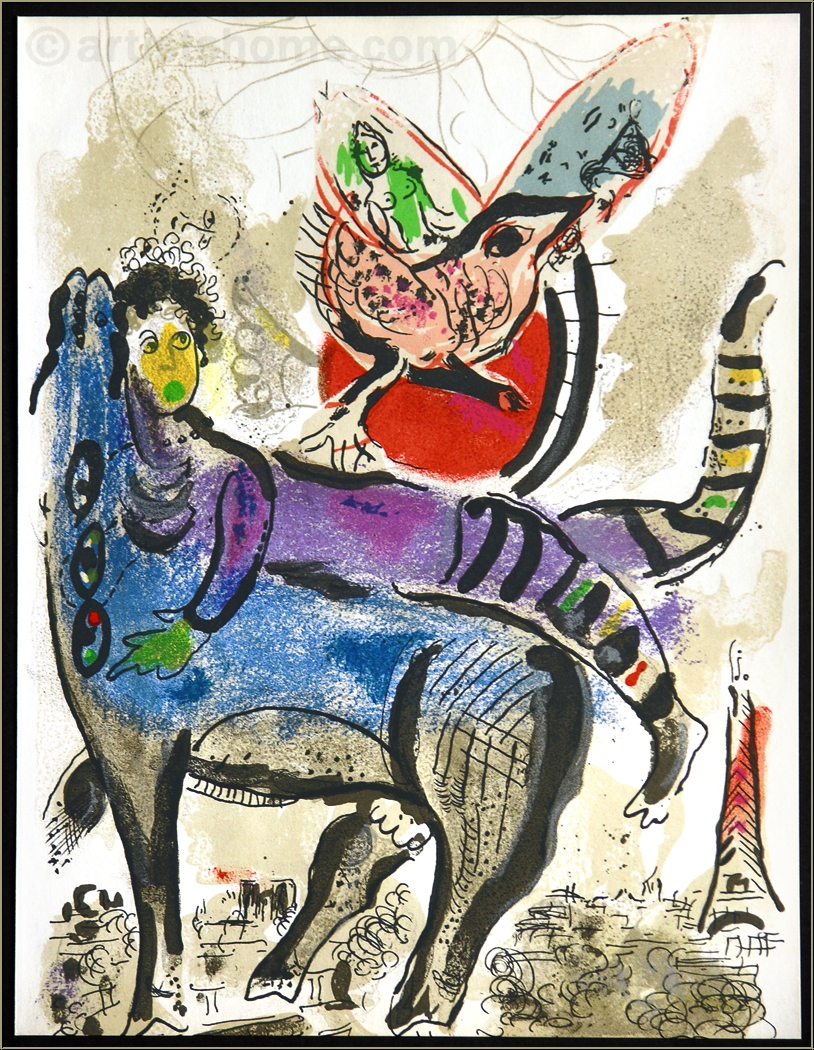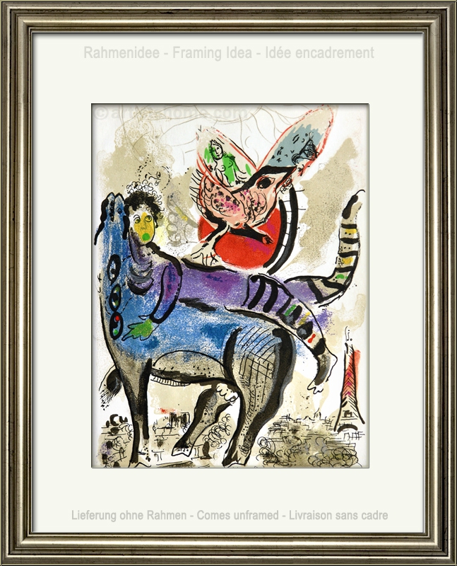 Détails :« La vache bleue » L’année de la parution de son remarquable portfolio « Le Cirque », Marc Chagall terminait cette magnifique lithographie joyeuse et colorée. Cet exemplaire est associé aux dessins du Cirque dans le catalogue raisonné des estampes de l’artiste – on peut donc supposer que lorsqu’il l’a dessiné, il avait déjà le cirque en tête. Il semble s’agir ici d’un de ses clowns typiques, reconnaissables à leurs pantalons bariolés. Où leur chemin les mène-t-il ? Cela nous reste encore à imaginer… Avec le grand oiseau et la belle jeune fille à l’arrière-plan, tous ces personnages semblent flotter dans l’air au-dessus de Paris, comme la Tour Eiffel de son côté.