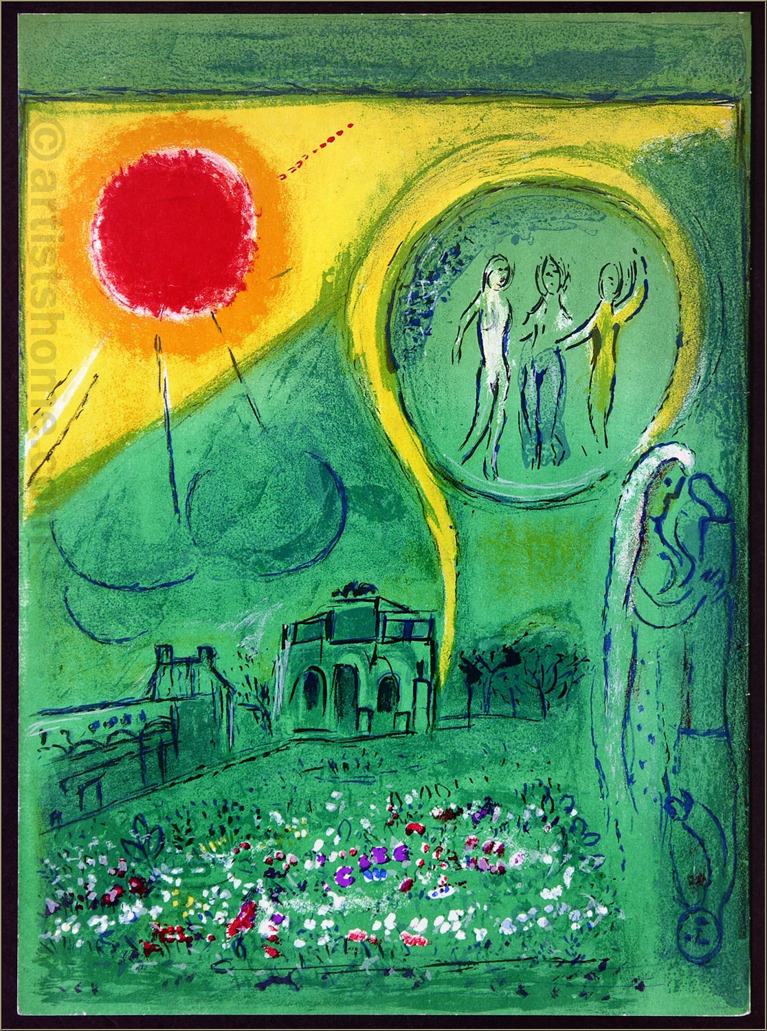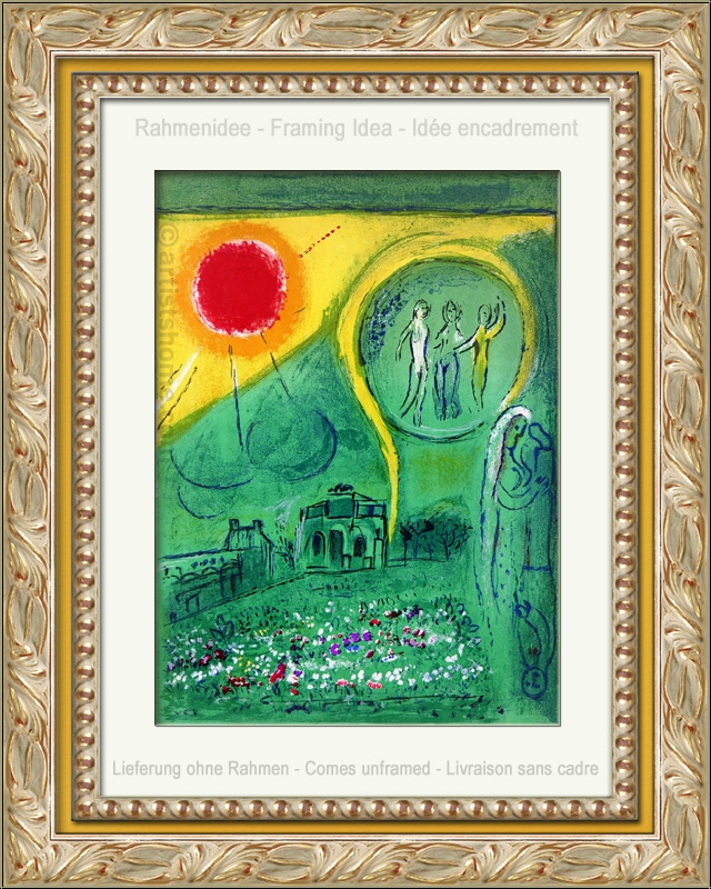 Détails :"Le Carrousel du Louvre" On ne peut que deviner le temps que Chagall a passé à étudier intensivement au Louvre dans ses débuts à Paris. Pour son œuvre "Le Carrousel du Louvre" avec vue sur l'Arc de Triomphe et le Musée du Louvre, il fait passer le vert abondant du Jardin des Tuileries au-dessus des vieux immeubles jusqu’au ciel ; seul un grand soleil interrompt son expansion. Qui peuvent être les 3 êtres qui flottent au-dessus de la scène, dans une sorte de bulle ? Dans tous les cas, c’est le printemps puisqu’un mariage est ou a été célébré dans la ville de l’amour. On peut toutefois se demander pourquoi la femme porte son mari sur la tête.