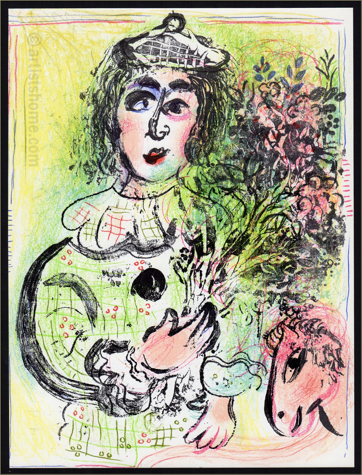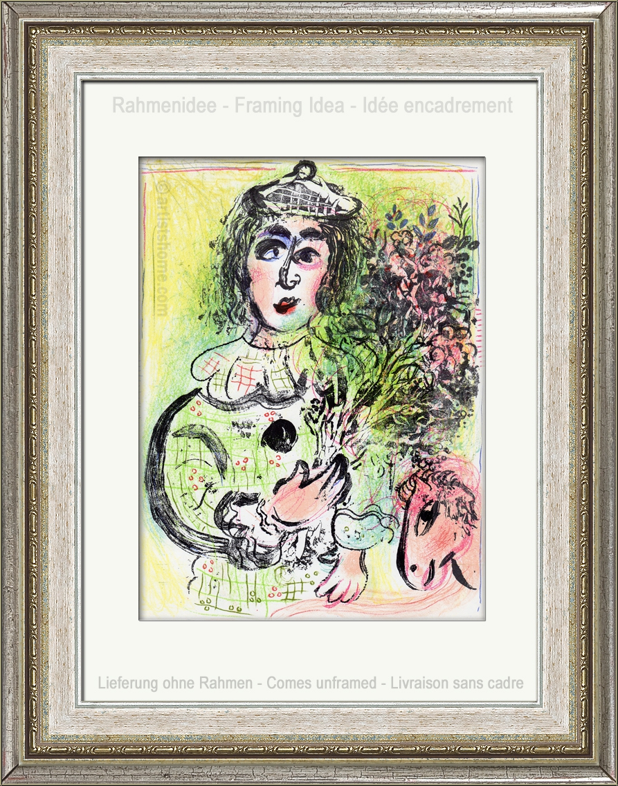| | « Le Clown fleuri » (Mourlot n° 399) | Technique : | Lithographie originale en couleurs Ceci n'est pas une copie reproduite (dupliquée sous forme de photolithographie ou autres) mais la lithographie de 1963, selon le catalogue raisonné ! | | Année de réalisation : | 1963 | | Dimensions: | 32 x 24 cm (papier = illustration) | | Tirage/Support: | Une des épreuves de l'édition limitée sur papier vélin, non signée (la lithographie a été tirée séparément sur vélin d'Arches à 150 exemplaires, numérotés et signés par l'artiste). | | Signature: | non signée, non numérotée | | Éditeur: | Éditions André Sauret, Monte-Carlo | | Imprimeur: | Mourlot, Paris | | Référence: | Mourlot, Fernand. Chagall Lithograph [III] 1962-1968, André Sauret, Monte Carlo, 1969, n° 399 Une photocopie du catalogue raisonné sera fournie. Vous recevrez, de plus, une preuve d'identité de l'œuvre (sans prix dans le cas d'un cadeau). | | État: | Details En très bon état de conservation ! Livraison non encadré. | | | Évaluations des clients : Il n'y a pas encore d'evaluations. Seulement les client qui ont acheté cet article et qui sont connecté peuvent l'evaluer. Votre nom est automatiquement affiché de manière anonyme, par ex. « Olivier M., France ».  *Valent pour les livraisons vers l'Allemagne payées via PayPal. En cas de paiement par virement bancaire, la livraison prendra un à trois jours de plus à partir du jour du virement en question. Pour connaître les délais de livraison pour d’autres pays et estimer le jour de livraison, rendez-vous ici |