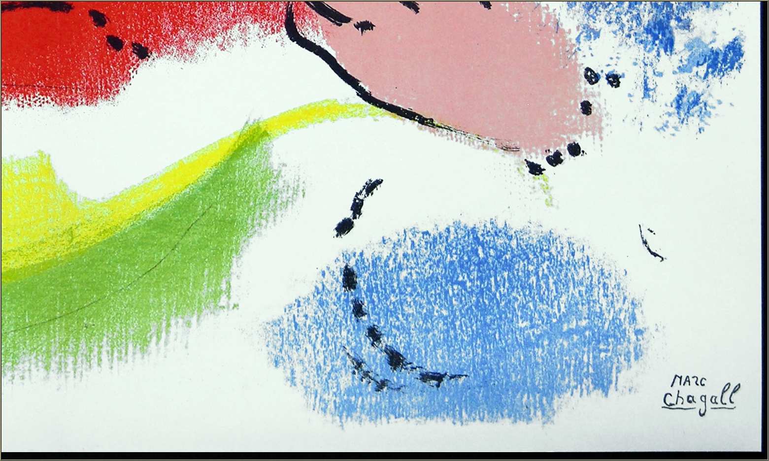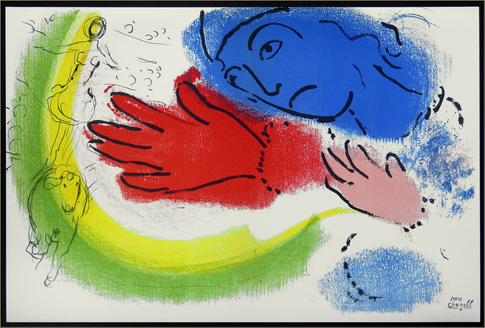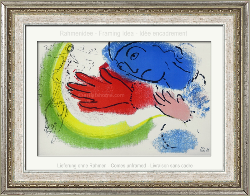 Détails :« L'écuyère » Après que Marc Chagall a terminé son premier travail d’illustration de la Bible en 1956, la réalisation d’une œuvre enjouée comme celle du Cirque lui a sûrement semblée bienvenue. En tous cas, il a réalisé à cette époque plusieurs œuvres comprenant des clowns, des acrobates et des artistes. Dans cette scène, l’observateur entrevoit l’acrobate, dessinée en filigrane au deuxième coup d’oeil. Au premier plan, l’artiste a représenté un portrait de femme qui semble se réveiller. Peut-être que l’acrobate est particulièrement concentrée, juste avant sa représentation. Ses mains, dessinées très grandes, l’une en rouge, l’autre en rose, semblent vouloir la protéger d’une chute malencontreuse.
