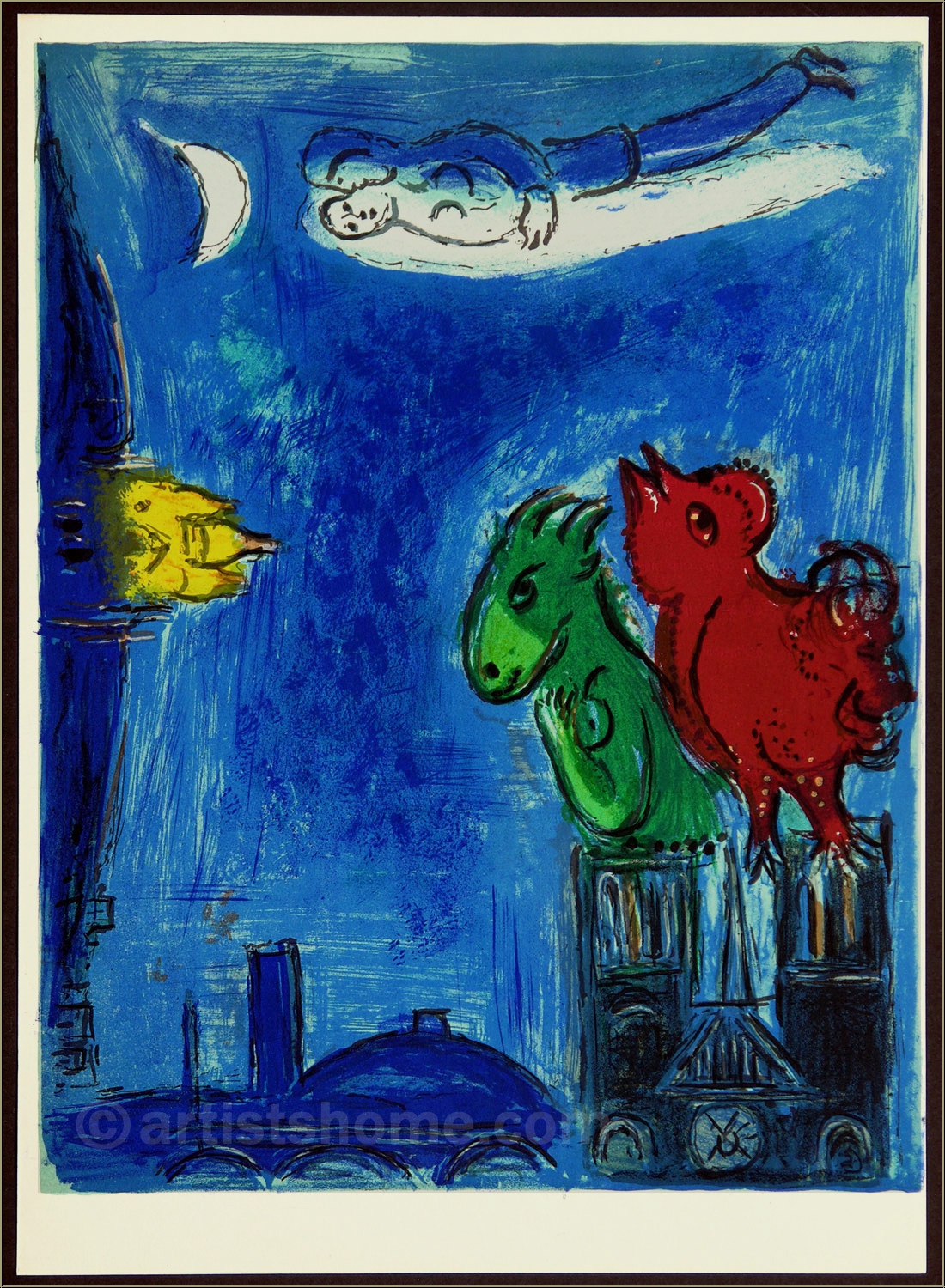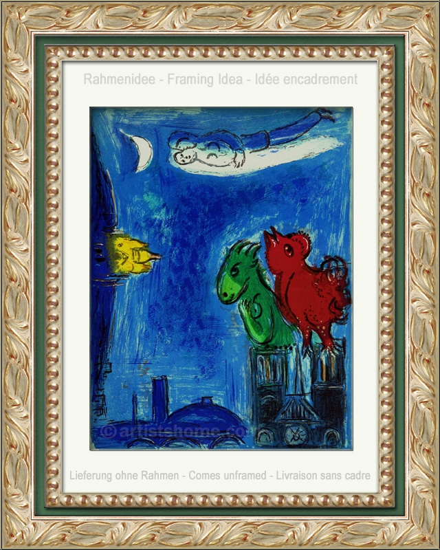 Détails :"Les Monstres de Notre-Dame" De la même manière que Quasimodo n’avait rien d’un monstre, les animaux de Chagall n’en sont pas non plus dans ce dessin. Chagall leur fait un clin d’œil en donnant leur nom à cette lithographie. Car, bien qu'il ait transporté son petit monstre surdimensionné sur le haut de Notre-Dame, le coq, nostalgique, dirige son regard vers le couple qui flotte au-dessus de lui, tandis que l’ânesse ne parvient pas vraiment à se décider entre le Sacré-Cœur et le Panthéon. Une scène paisible dans le crépuscule parisien, et une sublime estampe racontant l’histoire de Quasimodo et d’Esméralda dans une composition et un choix de couleurs typiques de Chagall.