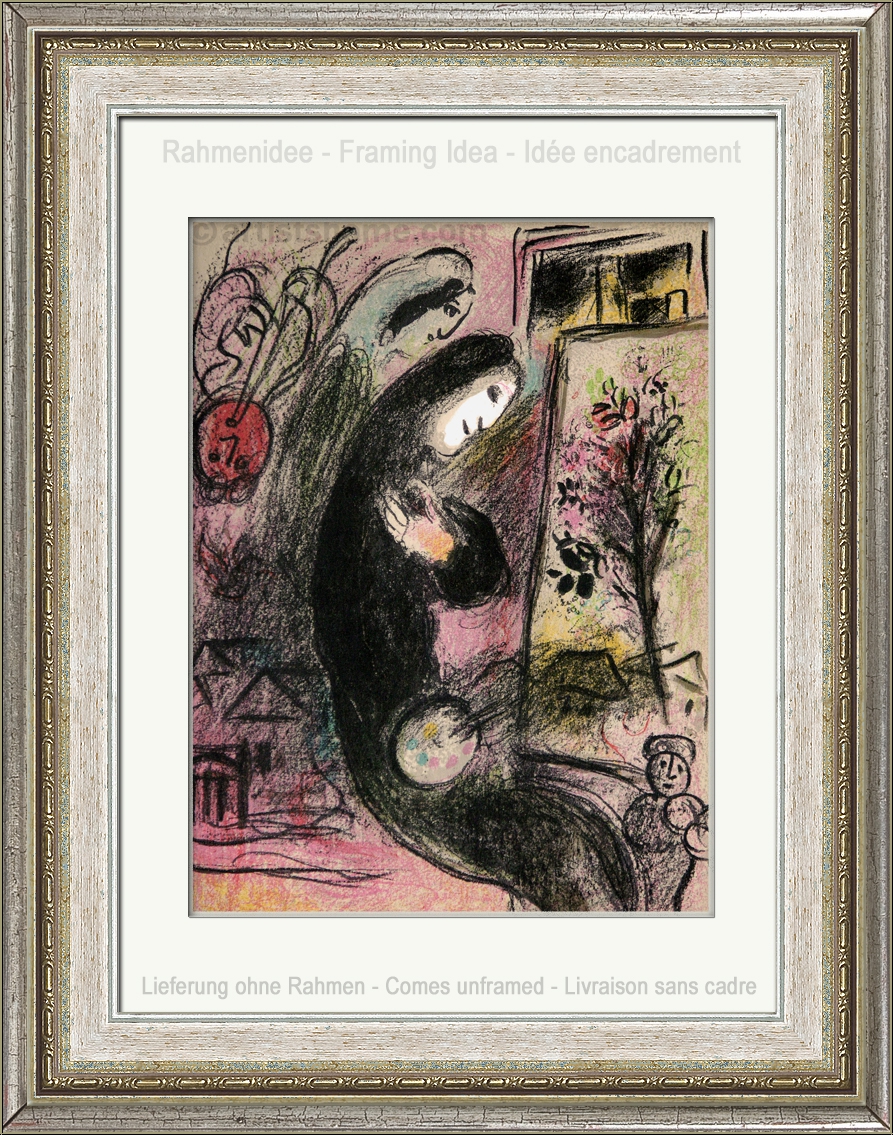 Détails :« L'inspiré » Autoportrait avec sa femme Vava Voici un autoportrait de ce grand artiste. Il y apparait comme perdu dans ses pensées devant l’un de ses peintures, qui semble représenter la Russie, son pays natal, comme le suggère le petit personnage en bas à droite de l’œuvre. Valentina (« Vava »), la femme de Chagall, qui est russe également, regarde par-dessus l’épaule de son mari, pleine d’envie. La peinture présente également de petits éléments surréels, typiques du travail de Chagall : les silhouettes des maisons qui semblent sortir du tableau, et un personnage avec une flûte ou un trombone, qui se tient sur la tête.