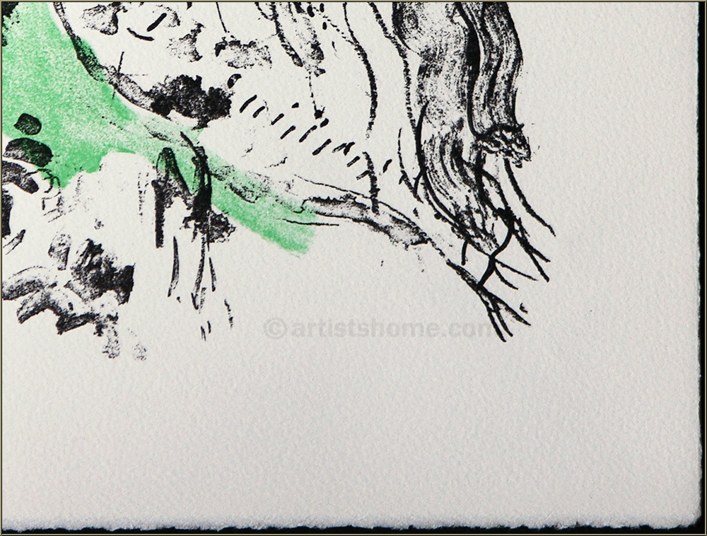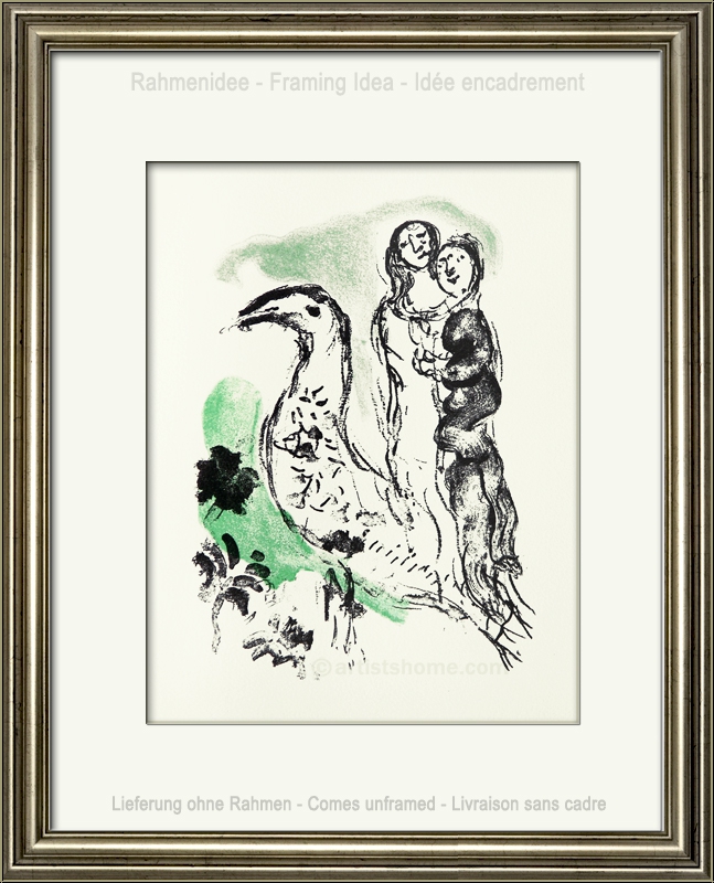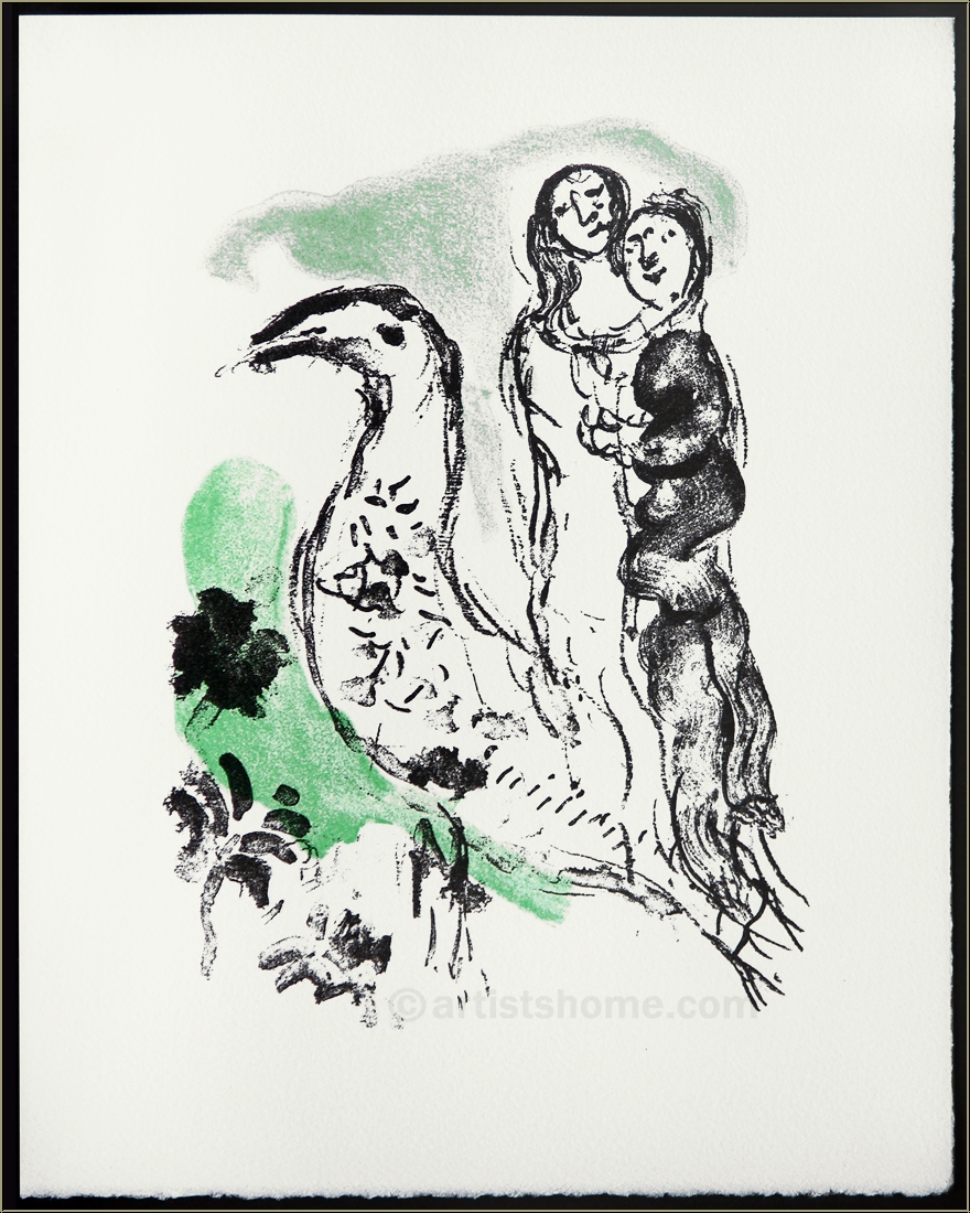 Détails :Frontispice pour « Élégie des alizés » Regardons ce couple qui semble en pleine conversation avec un ibis sacré rencontré sur le chemin dans cette estampe inhabituelle et rare de Chagall. On peut apprendre, dans son catalogue raisonné, que les quatre lithographies que l’artiste a dessinées sur ce thème en 1969 sont ses seuls travaux représentant des animaux exotiques. Cette captivante lithographie originale en couleurs a été utilisée en tant que frontispice pour l’œuvre « Élégie des alizés » de l’auteur L.S. Senghor et imprimée sur vélin épais d’Arches.