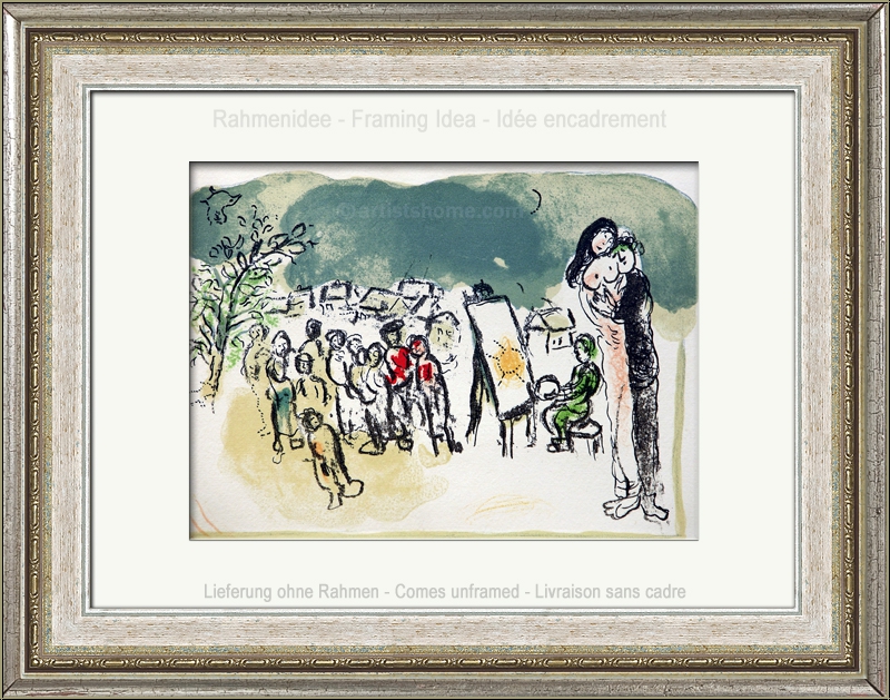 Détails :« Hommage à Julien Cain » Comme décor à cette scène d’amour tendre et sensuelle, Chagall a choisi un petit village de campagne, dont les habitants observent le peintre au travail. Marc Chagall, qui se représente le plus souvent avec des cheveux bouclés, s’est autorisé dans cette œuvre un double-portrait : tout d’abord, dans son propre rôle d’artiste célèbre, qui éveille l’intérêt du public. Mais aussi en tendre amant et fervent admirateur des femmes, tout particulièrement de sa première épouse Bella. Chagall a déplacé cette scène privée sur le bord extérieur droit de l’image – elle a lieu à l’écart du tumulte que l’artiste dépeint. Julien Cain, à qui cette œuvre est dédiée, a été un ami proche et un compagnon artistique de Chagall pendant des années. Il a notamment rédigé deux des six tomes du catalogue raisonné des estampes de Chagall.