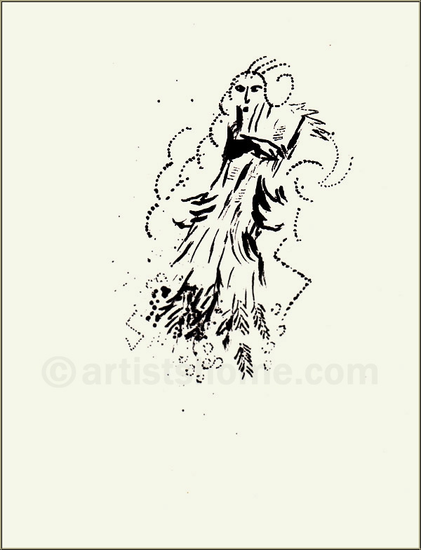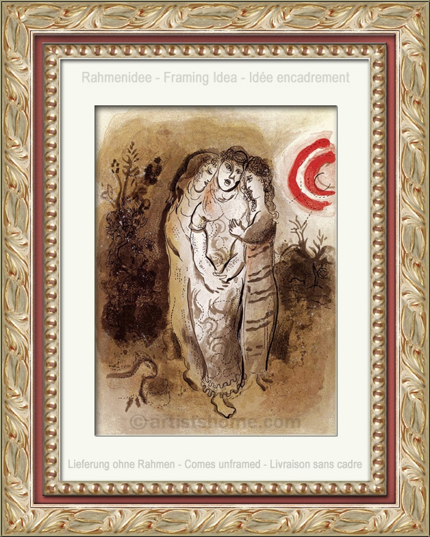 Détails :« Noémie et ses belles-filles » A travers cette estampe, Chagall démarre son voyage en images dans la vie de Ruth (Livre de Ruth 1, 1-14). Il montre Noémie, la belle-mère de Ruth, étroitement liée à ses deux belles-filles. Noémie, qui a perdu son mari et, plus tard, ses deux garçons à cause de la famine, se retrouve seule avec Ruth et Orpa. La vie que mènent ces trois femmes sans présence masculine était dure et amère, et seule leur solidarité sans faille leur permettait de survivre. Noémie, soucieuse de la vie de ses deux belles-filles, veut envoyer ces dernières dans leur pays d'origine, pour qu'elles puissent se remarier. Tandis qu'Opra obéit à la demande désintéressée de Noémie et s'en va, Ruth reste à Bethléem aux côtés de sa belle-mère, sans qui elle serait perdue. Ainsi Ruth fait-elle pleinement honneur à son prénom, qui signifie "amie". Marc Chagall a dédié une suite de 5 estampes au chapitre sur Ruth ; celle-ci est la première lithographie sur cette femme qui, grâce à son amour, sa confiance et sa persévérance envers Booz, devint la femme de Booz et ainsi l'arrière grand-mère du roi David.