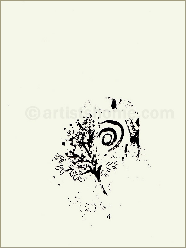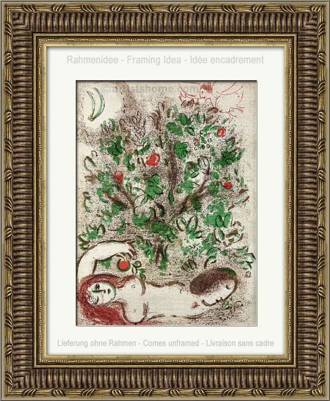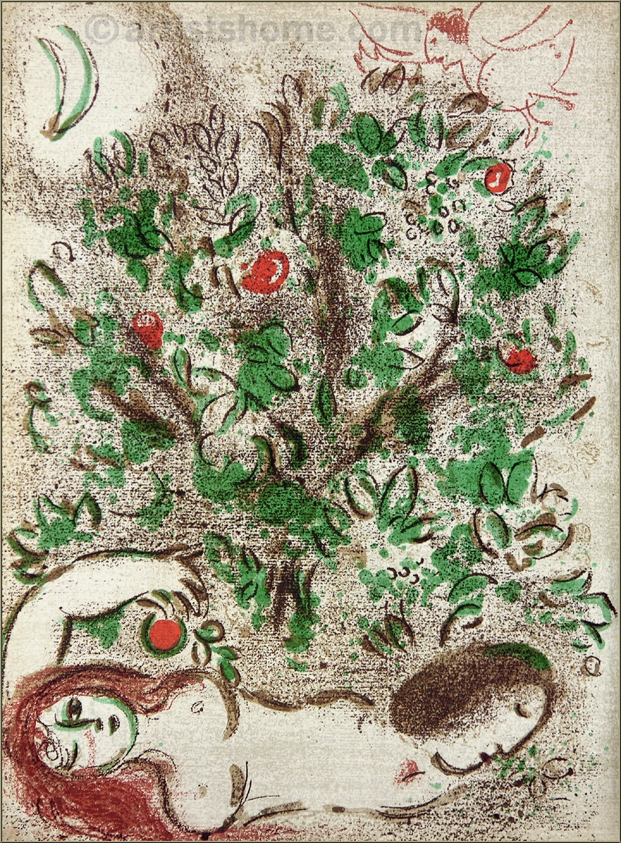 Détails :« Le Paradis » avec l’arbre de la connaissance Dans cette lithographie, Chagall a illustré le thème biblique de la chute originelle. Adam et Eve se reposent sous l’arbre du paradis. Ils sont devenus "une seule chair" (Genèse, 2.24), une unité : preuve qu’ils sont faits l’un pour l’autre. En hébreu, ils sont appelés "Adam et Adama" : Vir et Virago, ils se complètent. Mais ils se dressent contre Dieu, leur créateur, et veulent être comme lui. Ils se mettent ainsi à la place de Dieu, et c’est là la faute qu’ils ont commise. Sur le dessin, Eve cueille le fruit défendu, si beau et lumineux dans sa robe rouge. L’arbre verdoyant en est rempli, alors... un de plus, un de moins ? Adam dort encore, de la même manière qu’il n’est pas encore éveillé lorsqu’il prend le fruit des mains d’Eve et le croque. Il oublie la portée de leur action commune. Dans le coin supérieur gauche, le croissant de lune éclaire mystérieusement la scène. En haut à droite, on peut apercevoir un être volant avec un visage humain. Le paradis a perdu ses couleurs éclatantes, seul l’arbre de la connaissance brille d’un vert plein d’espoir.