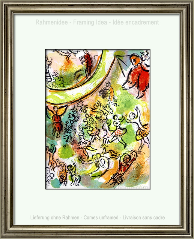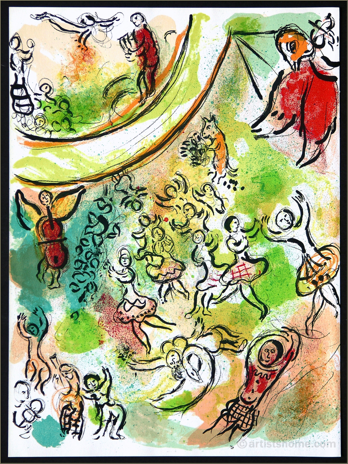Marc Chagall a dessiné cette superbe lithographie originale pour l’ouvrage traitant de sa fresque au plafond de l’Opéra de Paris. On peut y voir un joyeux petit groupe de personnages, musiciens et danseurs, dans des couleurs printanières.