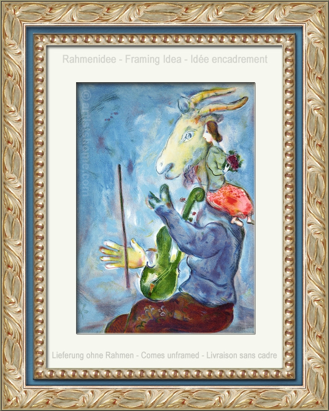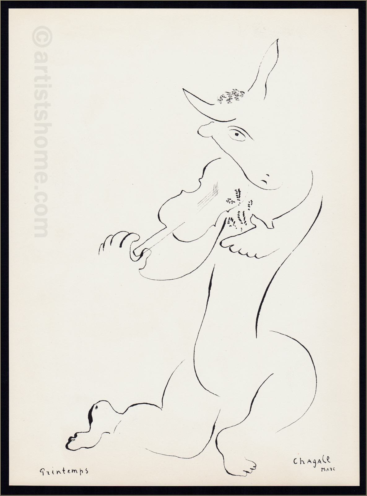 Détails :« Printemps » Un des talents remarquables de Chagall réside dans le fait qu’il créait des scènes féeriques, surnaturelles, et leur donnait vie comme si celles-ci étaient réelles. Dans ce dessin, nous voyons un bouc au corps humain, qui tient un violon dans son bras. Il a interrompu son jeu pour s’entretenir avec la fascinante jeune fille qui a pris place sur son épaule, et qui semble flirter avec lui. Pas de doute, c’est le printemps ! Cette charmante lithographie en couleurs intitulée « Printemps » constitue la contribution de Chagall à la revue artistique Verve, publiée en 1938 par l’éditeur français Tériade. Trois autres artistes renommés ont représenté les autres saisons : Paul Klee avec l’estampe « Hiver », Joan Miró avec « Été » et Abraham Rattner avec « Automne ».