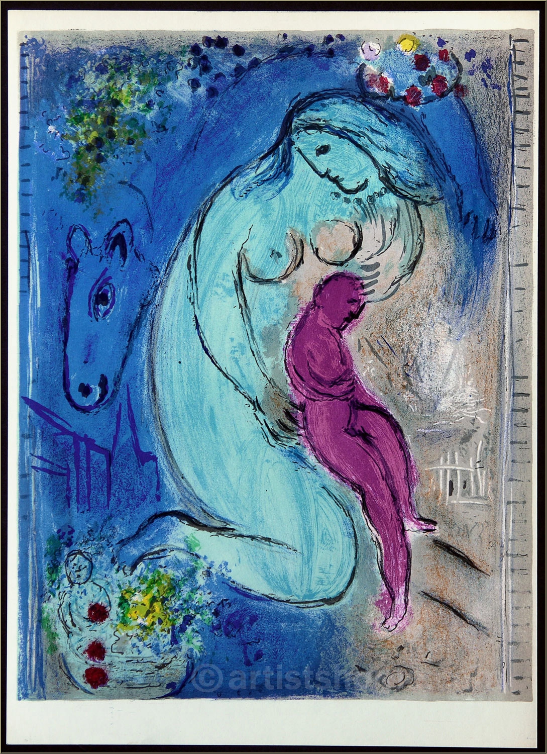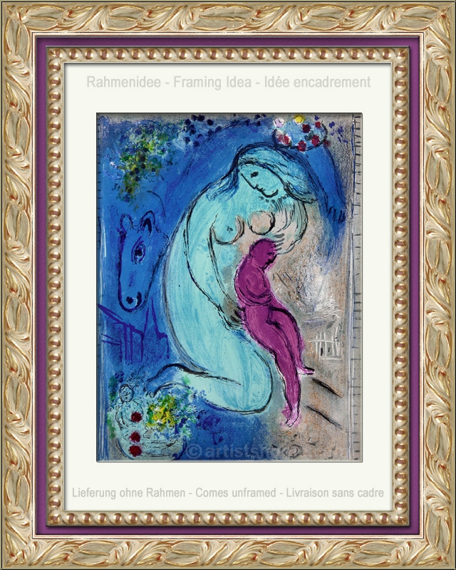 Détails :"Quai aux Fleurs" Comme souvent dans les œuvres de Chagall, dans "Quai aux Fleurs", ce qui est séparé dans l’espace est réuni sur le même dessin ; Chagall bouscule les règles établies selon ce qui lui semble opportun et renverse la tête de son personnage. Sur ce dessin, tout semble flotter, même la cathédrale (Notre-Dame ?) et même l’animal familier de Chagall, renforcé par le bleu intense du ciel de Paris. Le bras fleuri reste un mystère, qui semble surgir de la nuit et protéger ce couple mal assorti. Pour cette superbe estampe, Chagall a tout particulièrement nuancé les tons pastel clair de manière à faire penser que l’estampe a été colorée à la main.