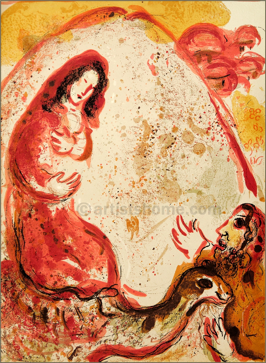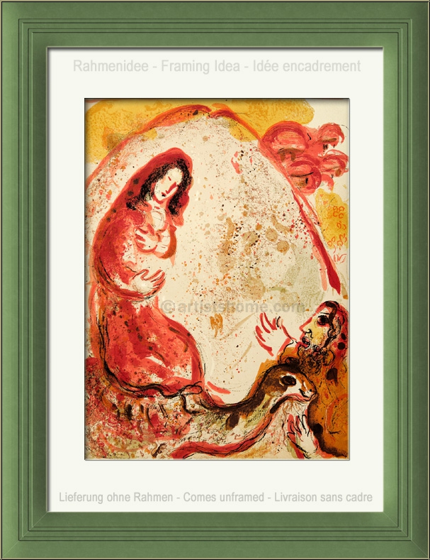 Détails :« Rachel dérobe les Idoles de son père » Rachel n’était pas seulement belle. C’était aussi une jeune femme déterminée et résolue dont Jacob, le père d’Israël, est tombé amoureux. Pour pouvoir l’épouser, il se mit au service de son père pendant 14 ans. Pourtant, malgré cet accord, Jacob refusa de laisser partir sa fille. Jacob décida alors de s’enfuir avec Rachel. Avant de se mettre en route, Rachel vola les théraphim de son père. D’après les coutumes de l’époque, cela permettait à Rachel de bénéficier de l’héritage de son père, auquel elle n’avait théoriquement pas droit en tant que fille cadette. Le père poursuiva le couple de fugitifs et fouilla leurs bagages. Déterminée, Rachel cacha les théraphim dans les sacoches de son chameau et s’assit dessus. Quand son père lui ordonna de descendre du chameau, elle prétendit se sentir mal et empêcha ainsi son père de découvrir les théraphim. Cette lithographie montre Rachel assise en position de soumission face à son père qui réclame les théraphim que sa fille lui a volés. Rachel se trouve toutefois en position de force, comme cela est représenté sur le dessin par le fait qu’elle soit placée plus haut que son père, dans la mesure où elle s’est libérée de l’omnipotence de son père. Ainsi Chagall a-t-il illustré de manière saisissante, dans cette œuvre, un grand problème existentiel auquel sont confrontées, aujourd’hui encore, de nombreuses femmes. Moralité : une action portée par la détermination peut atténuer une injustice!