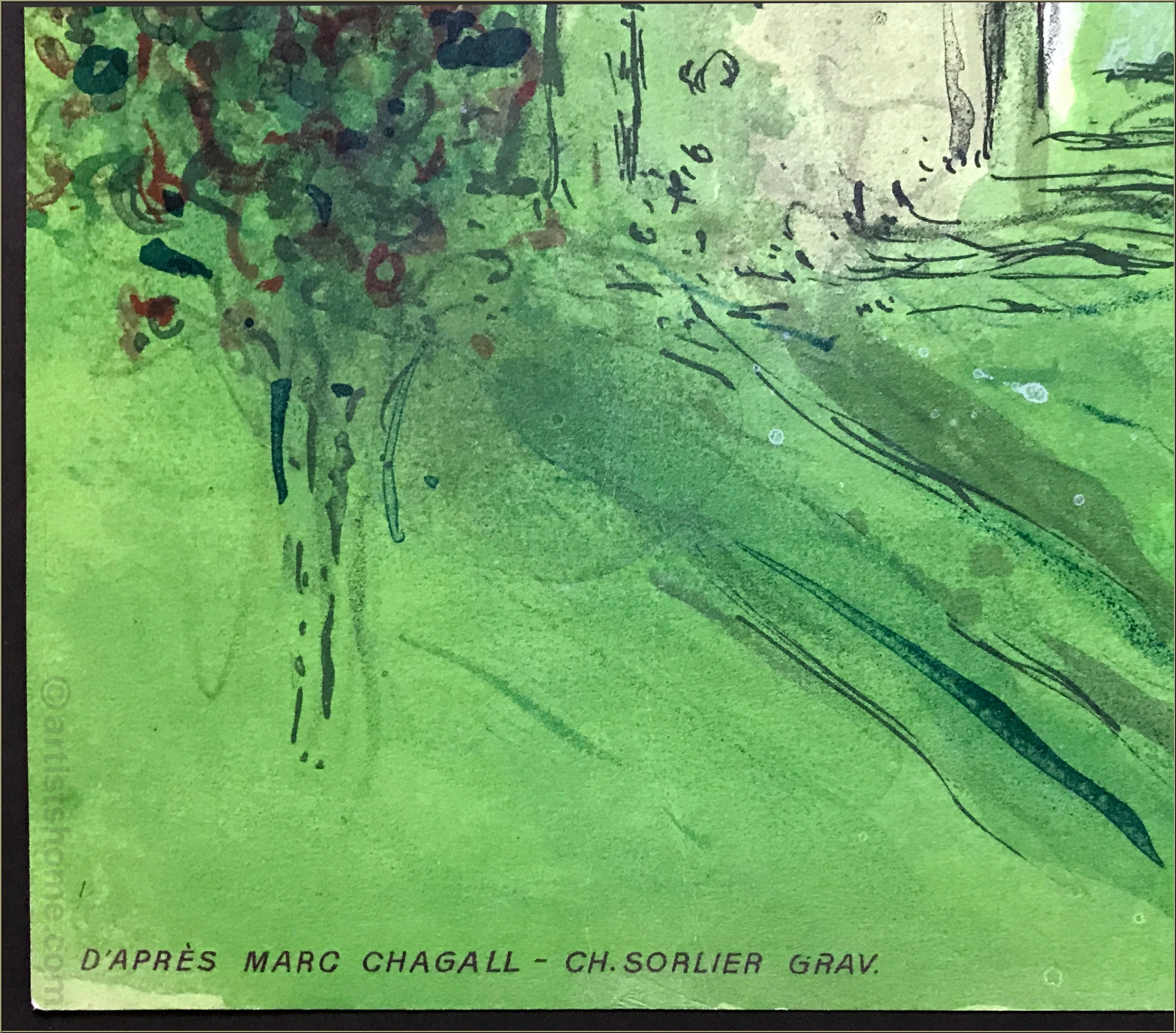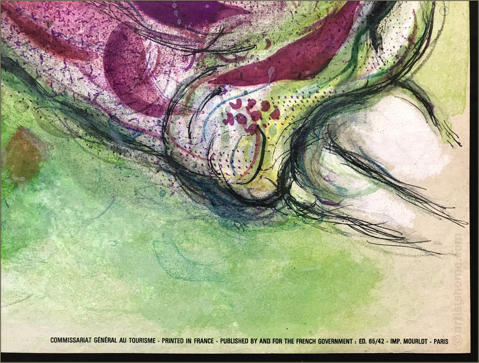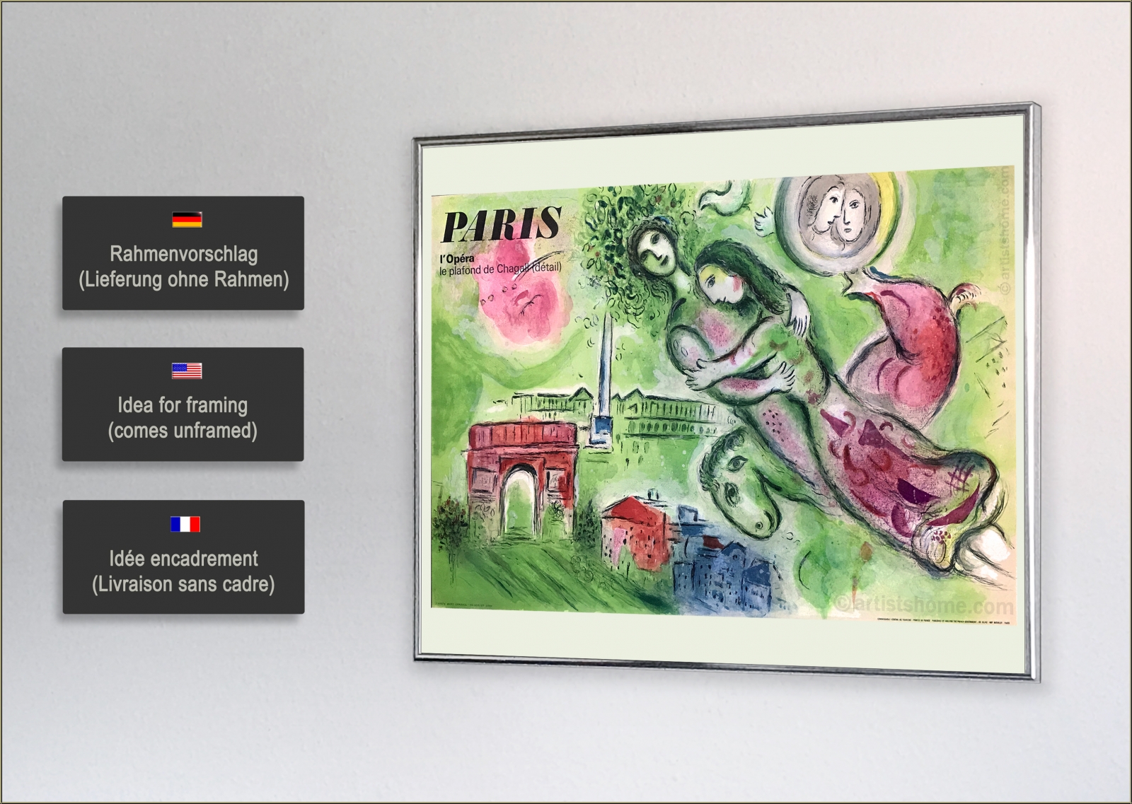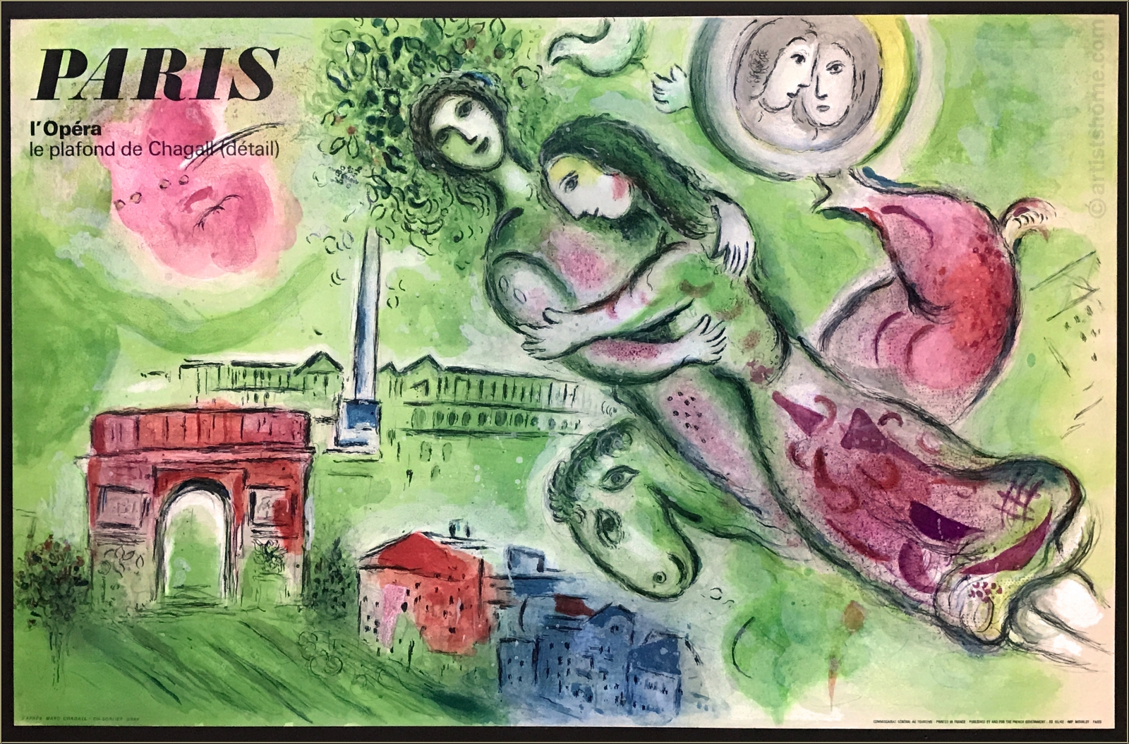 Détails :« Roméo et Juliette » Paris l'Opéra, le plafond de Chagall (1964) Cette affiche fut publiée en 1964 pour destinée à la publicité du Tourisme francais dans le monde. Elle a été exécutée par Charles Sorlier chez Mourlot sous la direction du Maître, d'après un détail du plafond de l'Opéra de Paris.