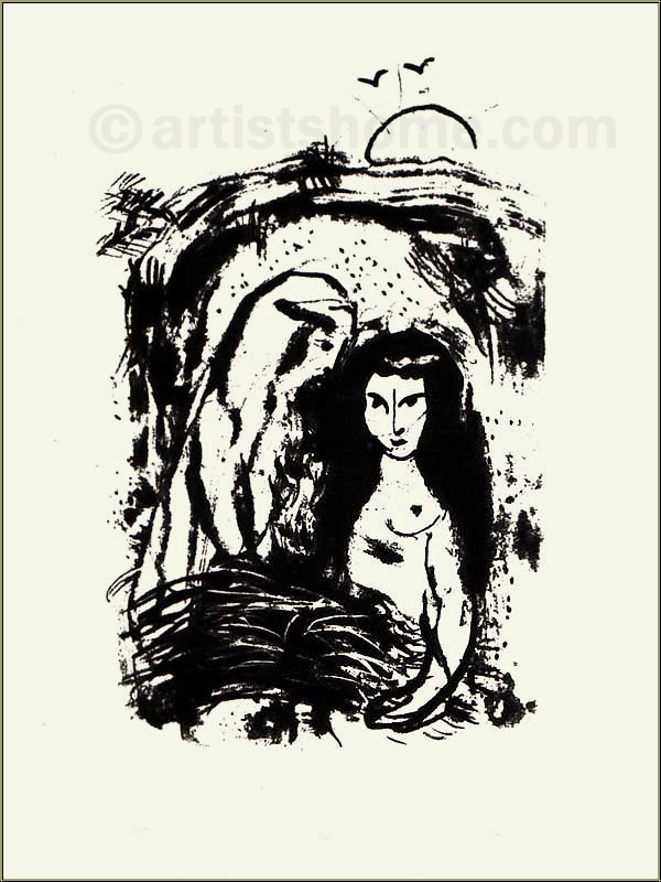 Détails :« Ruth aux pieds de Booz » Ceci est l'une des images typiques dans lesquelles Chagall exprimait sa conception presque timide de la sexualité : à la lumière de la lune, Ruth se couche aux pieds de Booz, sur les conseils de sa belle-mère Noémie. Les deux veuves craignent pour leur survie, aussi leur semble-t-il judicieux de se lier au bienveillant et bienfaisant Booz par des subterfuges féminins : la fin justifie les moyens (Livre de Ruth 3, 7). Ce que Chagall ne nous montre pas : dans la nuit noire, vers minuit, Booz se réveille et se laisse séduire par Ruth. La position hostile de l'église vis-à-vis de la sexualité jusqu'à nos jours ne permettait pas à Chagall d'être ici implicite. Seule la poitrine dénudée de Ruth évoque l'érotisme de la situation. Côté couleurs, sur cette estampe, Chagall a utilisé sans compter toutes les nuances de marron disponibles. Marc Chagall a dédié une suite de 5 estampes au chapitre sur Ruth ; celle-ci est la quatrième et avant-dernière lithographie sur cette femme qui, grâce à son amour, sa confiance et sa persévérance envers Booz, devint la femme de Booz et ainsi l'arrière grand-mère du roi David.