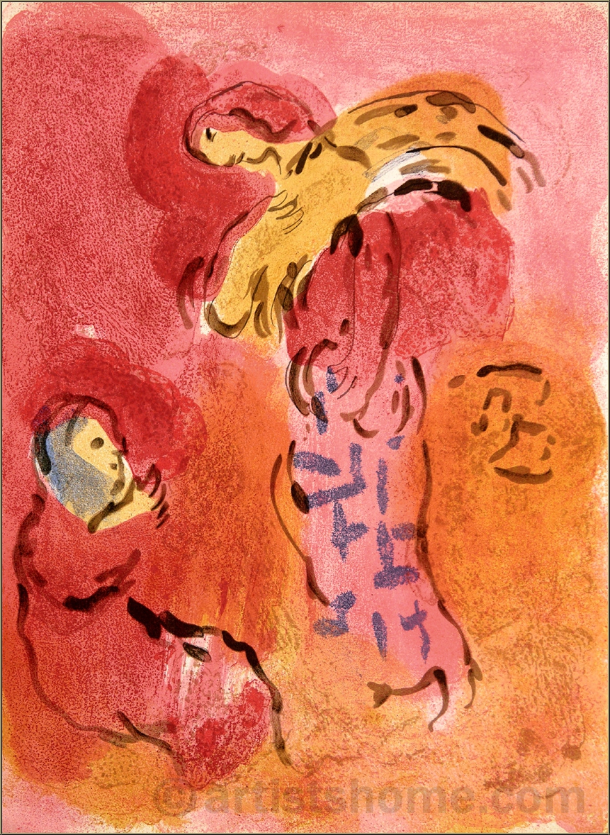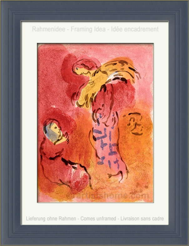 Détails :« Ruth glaneuse » Dans cette deuxième estampe d'une série de cinq sur la vie de Ruth, Chagall nous montre son "héroïne", qui revient de glaner des épis, chaleureusement accueillie par sa belle-mère Noémie. La belle-fille a la vie dure en tant qu'étrangère devant lutter pour la survie de deux femmes en terre inconnue (Livre de Ruth 2, 1-3). Pourtant, pour cette estampe, Chagall a choisi des nuances de rose lumineuses et gaies, peut-être pour faire comprendre qu'il est question d'amour, sous différents points de vue. De l'amour bienveillant de la belle-fille, qui parvient à les garder toutes les deux en vie grâce à son courage. Et du début de l'amour entre Ruth et Booz, qui remarque rapidement cette femme exceptionnelle et en tombe amoureux. Marc Chagall a dédié une suite de 5 estampes au chapitre sur Ruth ; celle-ci est la deuxième lithographie sur cette femme qui, grâce à son amour, sa confiance et sa persévérance envers Booz, devint la femme de Booz et ainsi l'arrière grand-mère du roi David.