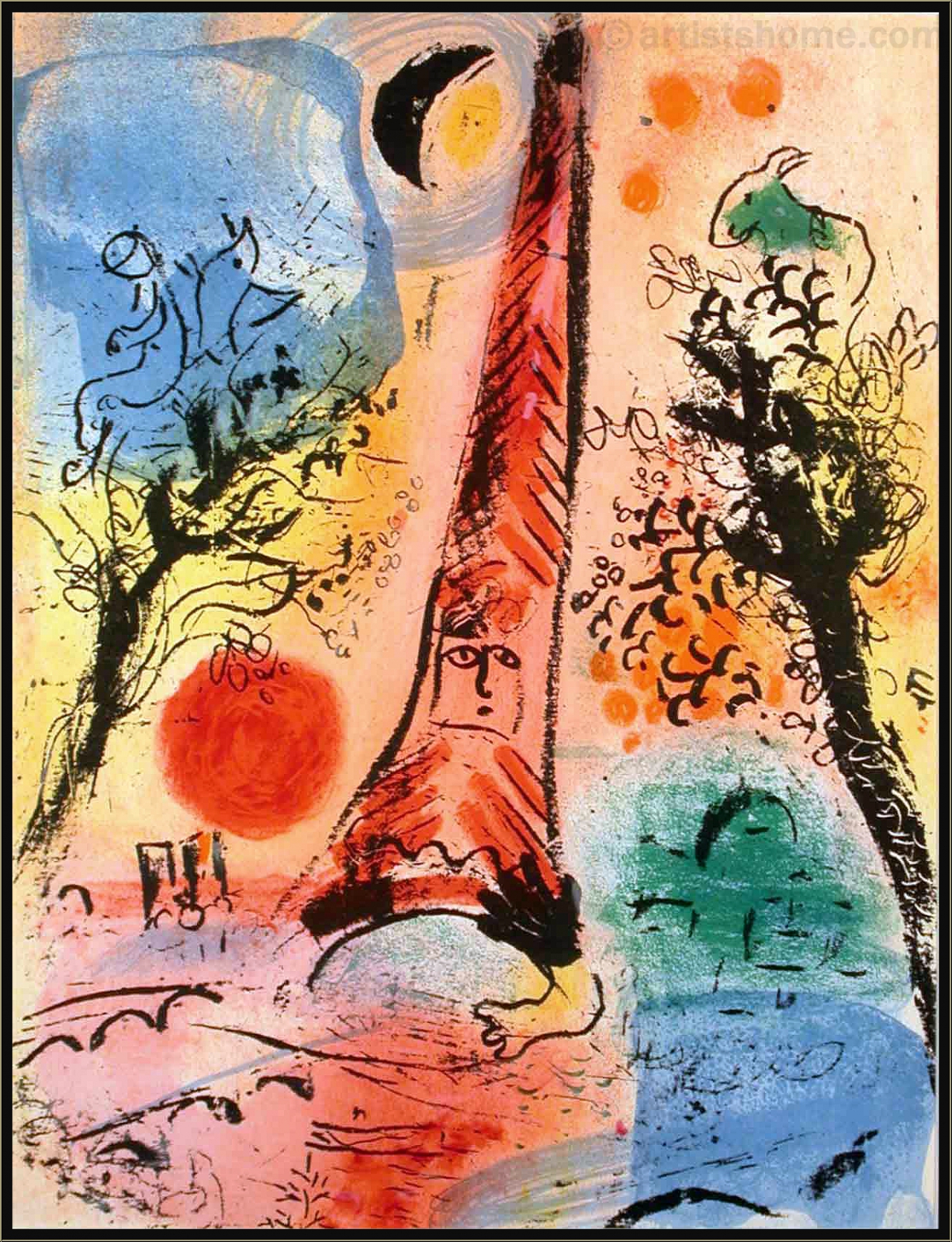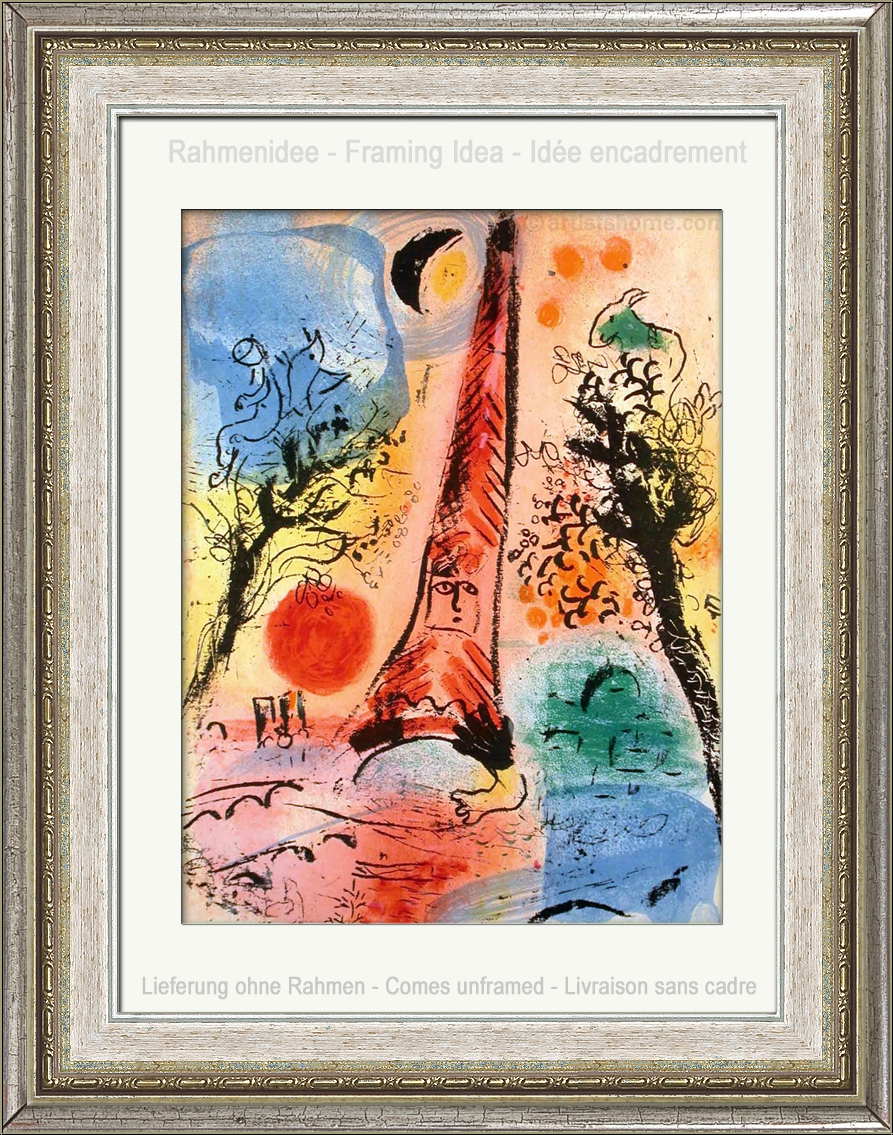 Détails :"Vision de Paris" (Mourlot 287) « Mon art a besoin de Paris comme un arbre a besoin d’eau » martelait Chagall lorsqu’on l’interrogeait sur les raisons de son départ de sa Russie natale. Il semblait étouffer dans le mutisme, le spleen et le manque de couleur que devaient transmettre Liozno, sa ville de naissance située dans la voblast de Vitebsk, ainsi que tout son entourage familier de l’époque. Paris est devenue une seconde patrie pour Chagall, car elle symbolisait pour lui cette liberté ardemment désirée. Ce n’est donc pas étonnant que l’image que Chagall donne de Paris comporte toujours un feu d’artifice de couleurs. Les multiples facettes colorées de cette ville effervescente l’ont sûrement énormément enthousiasmé ; elles se reflètent dans ce dessin, soulignées par le choix remarquable des couleurs : qui d’autre que Chagall aurait eu l’idée de combiner un rose léger avec un orange lumineux ? Avec ses nombreuses petites impressions et ses symboles typiques, cette estampe appartient certainement aux travaux de l’artiste les plus admirables et les plus joyeux.