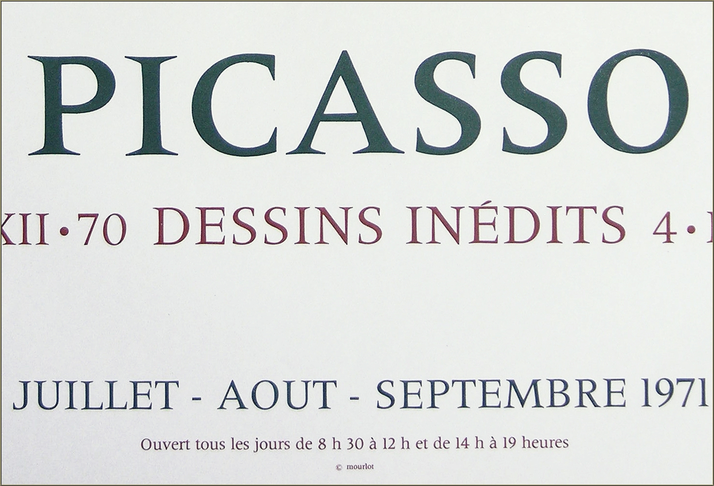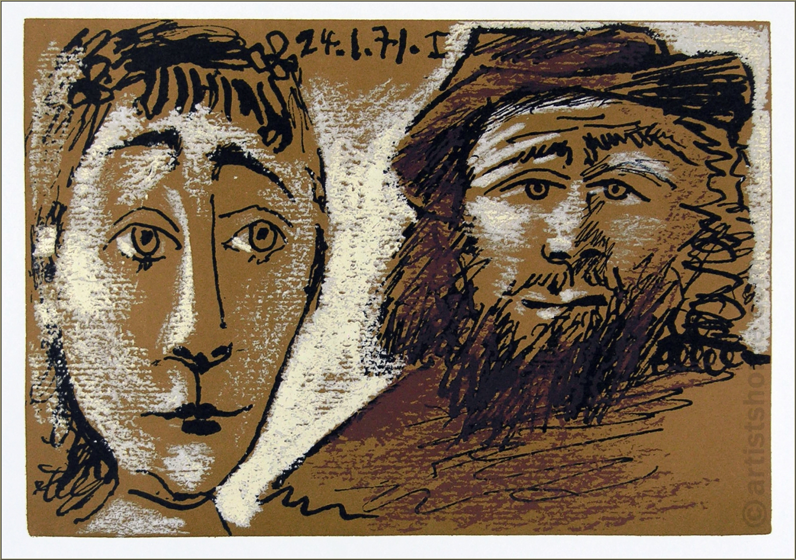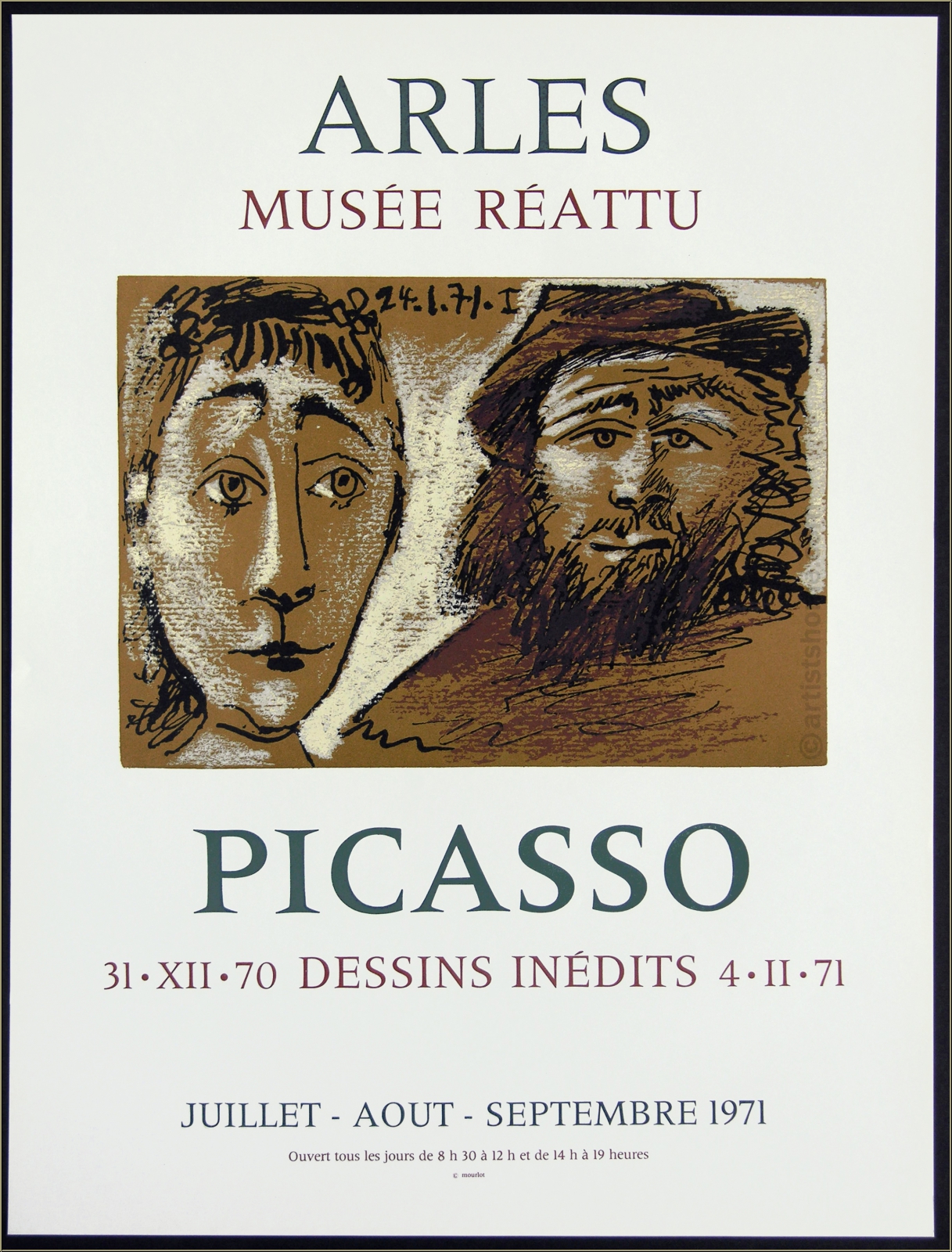 Détails :Picasso - Dessins inédits - Arles, Musée Réattu, 1971 Affiche d’exposition originale avec la lithographie en couleurs « Homme et femme », d’après un dessin de l’artiste réalisé la même année, et lithographié en couleurs par Mourlot. L’impression est datée du 24/01/1971. Il s’agit d’une affiche impressionnante pour le musée Réattu en Camargue, auquel Picasso a fait don de 57 dessins en 1971, deux ans avant sa mort. L’image, en tons ocres, rappelle les linogravures de l’artiste. On y voit un gros bonhomme, sur la droite, à l’air pataud, le visage surmonté d’un béret. La femme, de son côté, à un visage particulièrement allongé qui fait penser à un dessin de Buffet. Cette lithographie originale à une place particulière dans la production lithographique de Picasso, reproduisant un de ses dessins de l’époque.