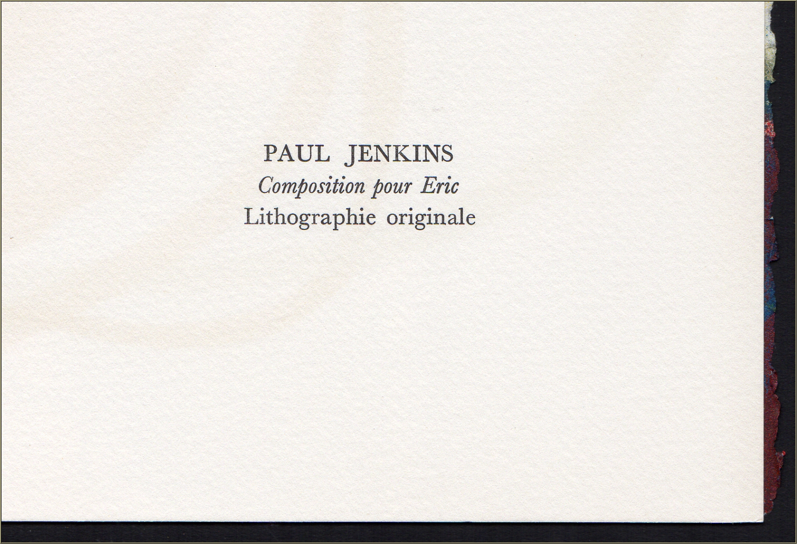 | | « Composition pour Eric » 1972 | Artiste : | Paul Jenkins *1923 Kansas City, USA - †2012 New York City, USA | | Technique : | Lithographie originale en couleurs, imprimée par Mourlot, signée dans la pierre. Texte au verso : « Paul Jenkins - Composition pour Eric - Lithographie originale » Ceci n'est pas une reproduction récente (tirage d'art) qui a été copiée selon des procédés de reproduction photomécanique, mais la lithographie originale de 1972. ATTENTION: il semble actuellement que des impressions d'apparence similaire sont disponibles à la vente sur internet pour de faibles sommes. Il s'agit de réimpressions tardives et non autorisées (des copies pirates). Ces tirages ne sont pas des lithographies originales ! | | Année de réalisation : | 1972 | | Formats : | 50 x 32,5 cm (feuille), pli central normal des lithographies publiées en doubles pages | | Tirage | Papier : | Une des 800 épreuves de l'édition limitée sur papier Arches, non signée | | Éditeur : | Alain C. Mazo, Paris u. Léon Amiel, New York, 1972 | | Imprimeur : | Mourlot, Paris | | Référence : | cf. https://mourlot.com « Livres de Fernand Mourlot » Une preuve d'identité de l'œuvre sera fournie (sans prix dans le cas d'un cadeau). | | État : | Details En parfait état de conservation. | Évaluations des clients : Il n'y a pas encore d'evaluations. Seulement les client qui ont acheté cet article et qui sont connecté peuvent l'evaluer. Votre nom est automatiquement affiché de manière anonyme, par ex. « Olivier M., France ».  *Valent pour les livraisons vers l'Allemagne payées via PayPal. En cas de paiement par virement bancaire, la livraison prendra un à trois jours de plus à partir du jour du virement en question. Pour connaître les délais de livraison pour d’autres pays et estimer le jour de livraison, rendez-vous ici |