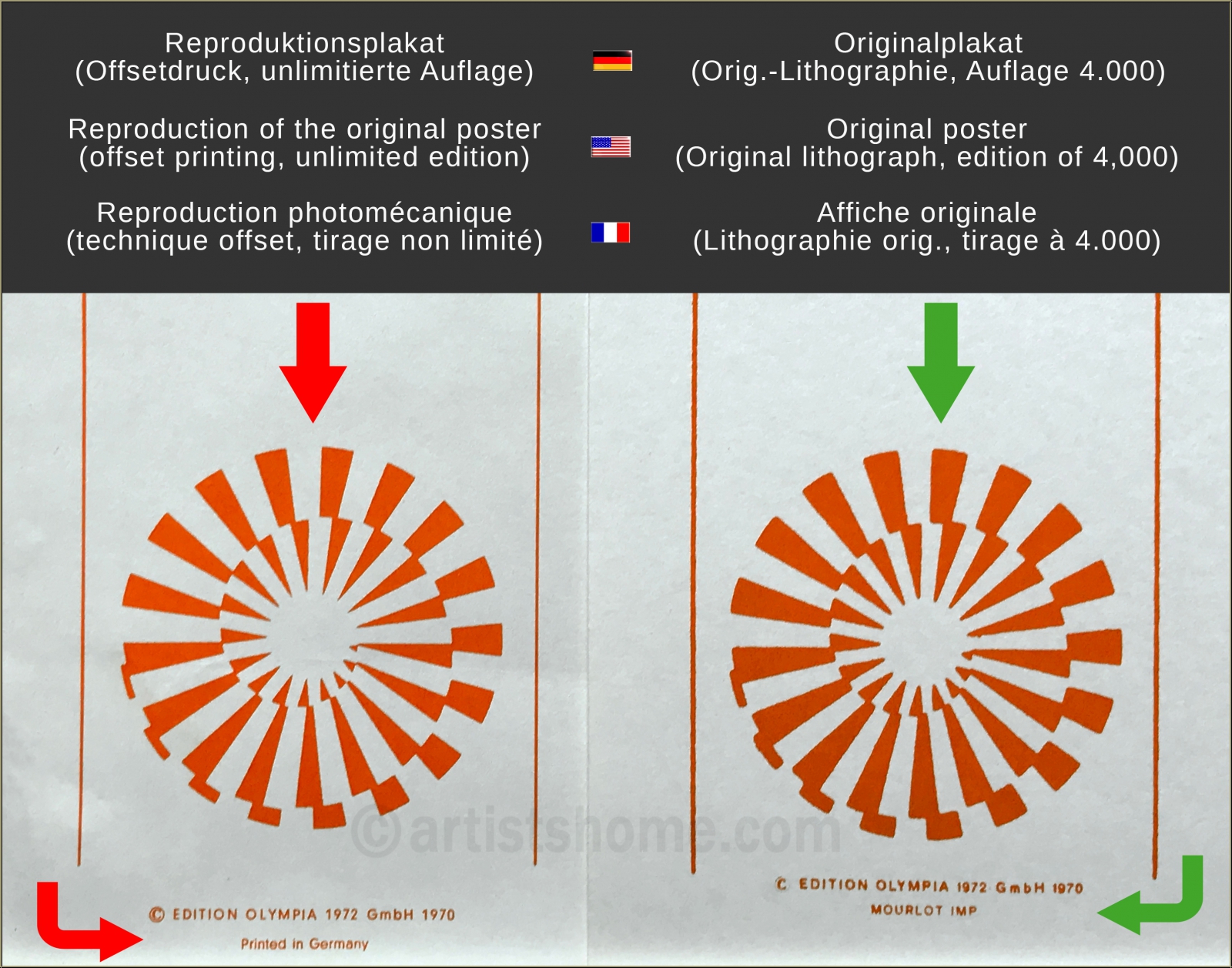 Il est en effet difficile de faire la différence entre les affiches originales et les reproductions en offset, surtout sur internet. Cette différence peut être faite en étant attentif aux caractéristiques comme la technique d’impression, le papier employé, ainsi que les mentions d’impression.