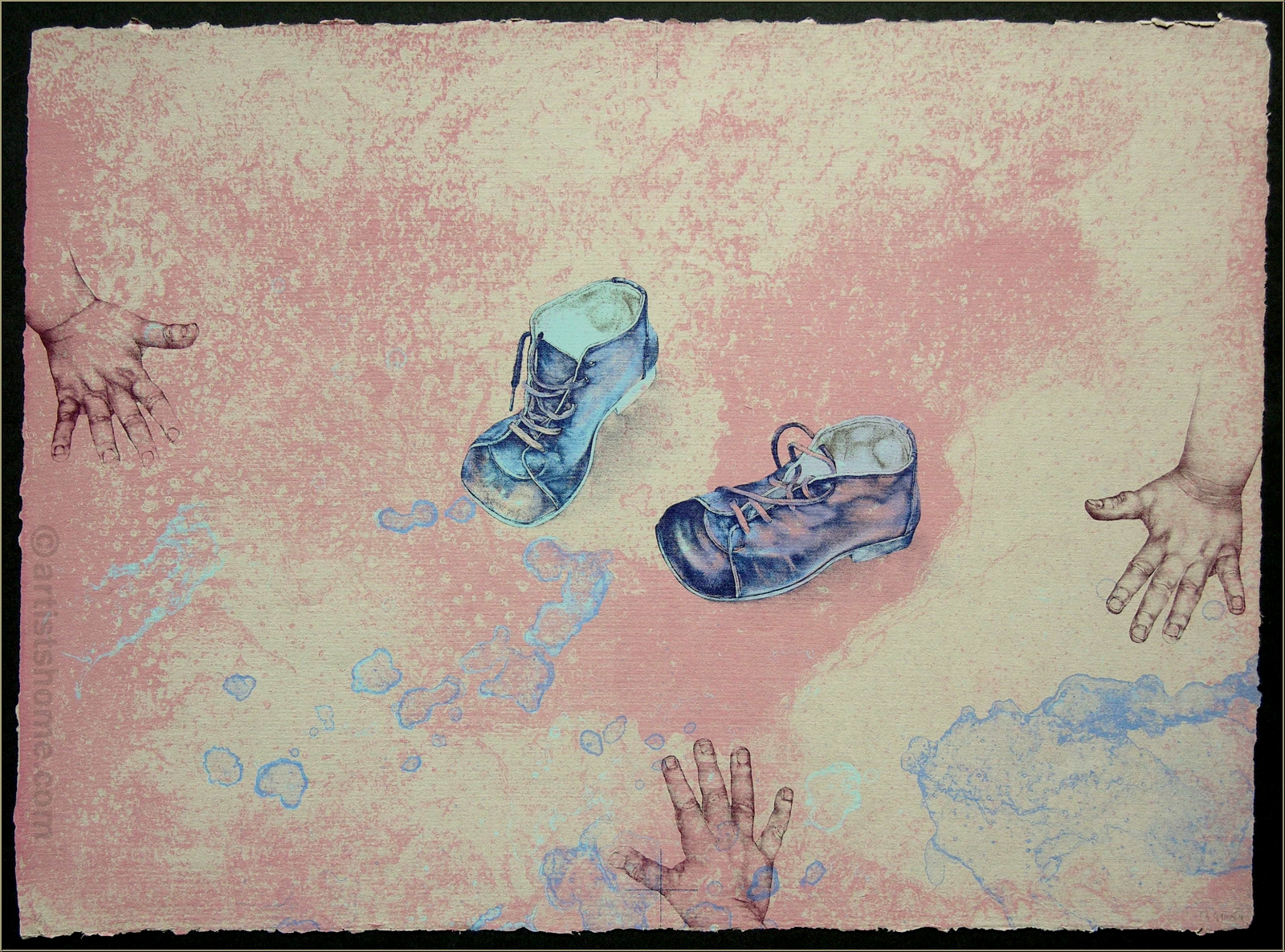 Reiner Schwarz: Lithographie signée « Kinderspiel » (rose) 1974 Paire de chaussures pour enfants, piéce unique